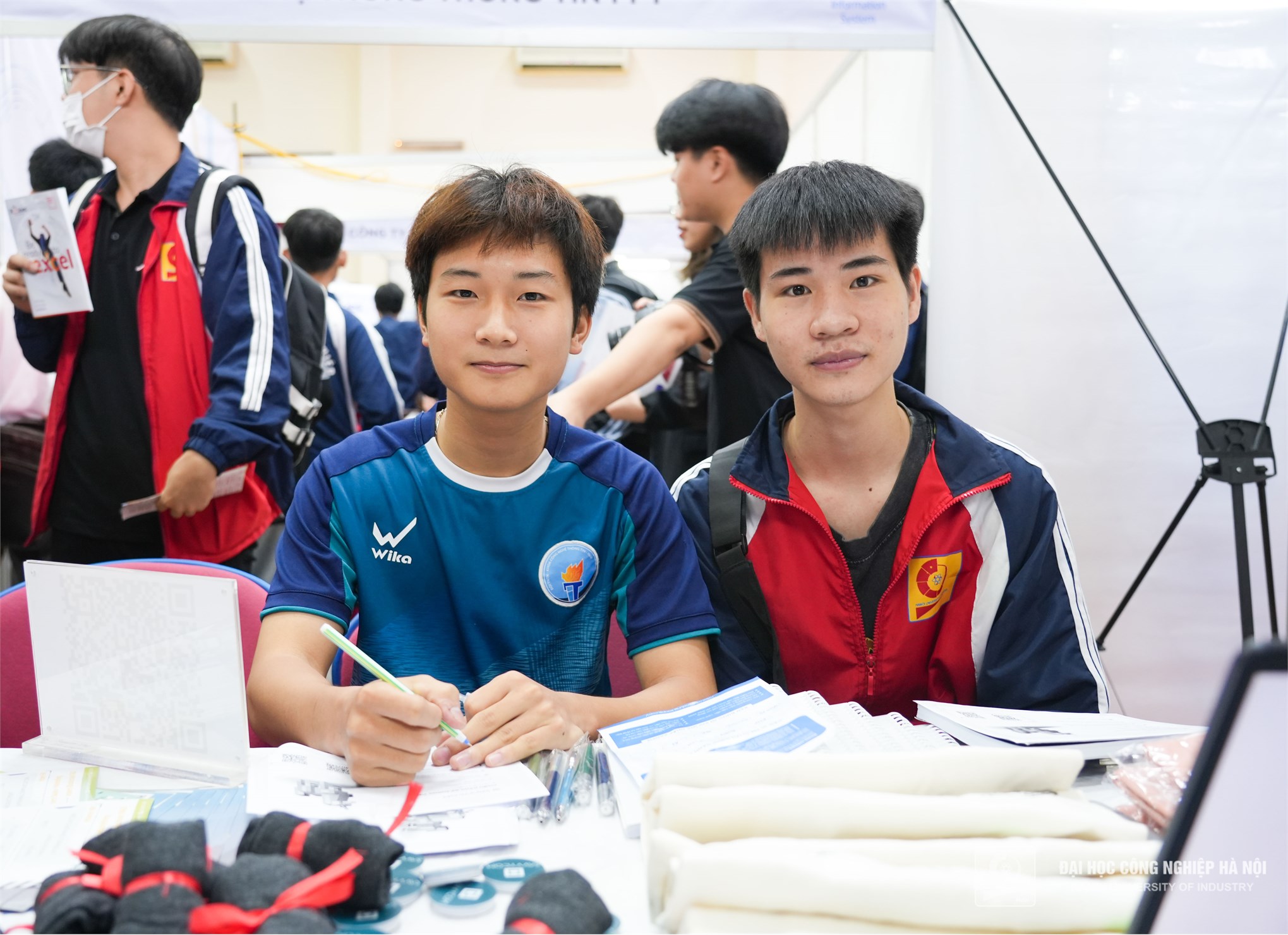 Hai bạn Đỗ Thành Đạt và Nguyễn Văn Tuấn - Lớp Kỹ thuật phần mềm có mặt tham dự chương trình từ rất sớm. Hai bạn chia sẻ: Mỗi lần tham dự ngày hội việc làm của Trường và của Khoa, chúng em đều rất háo hức, bởi có cơ hội tìm hiểu nhiều hơn về doanh nghiệp, được giao lưu gặp gỡ các anh chị đi trước.