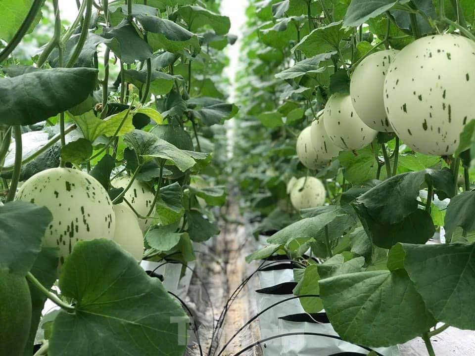 Dưa được trồng trong nhà màng, được tự động hóa theo công nghệ hiện đại với quạt mát, phun sương tưới ẩm.