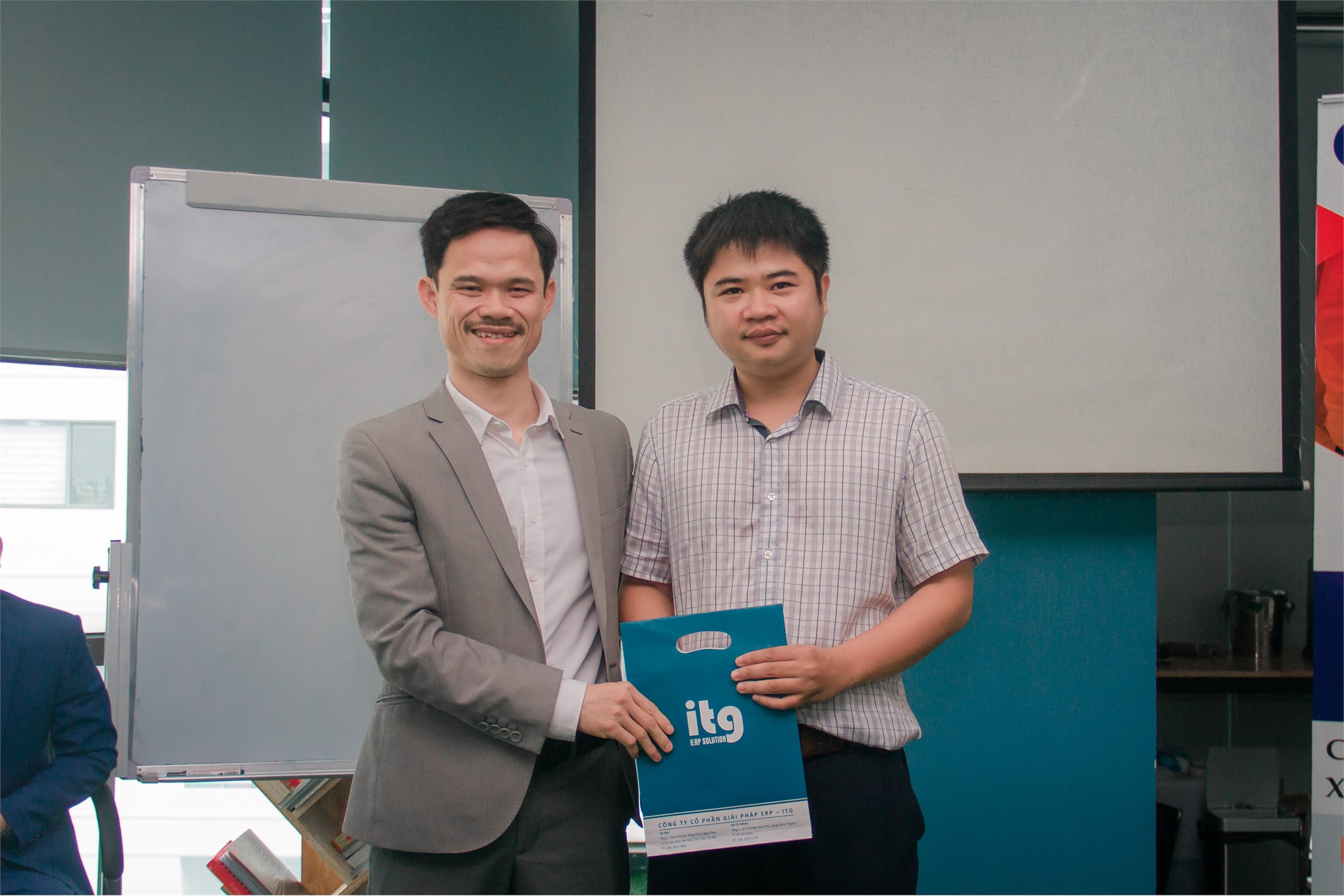Thầy Trịnh Bá Quý – Bí thư Liên chi đoàn khoa CNTT – trường Đại học Công Nghiệp Hà Nội nhận quà cảm ơn từ Anh Nguyễn Xuân Hách – đại diện ITG