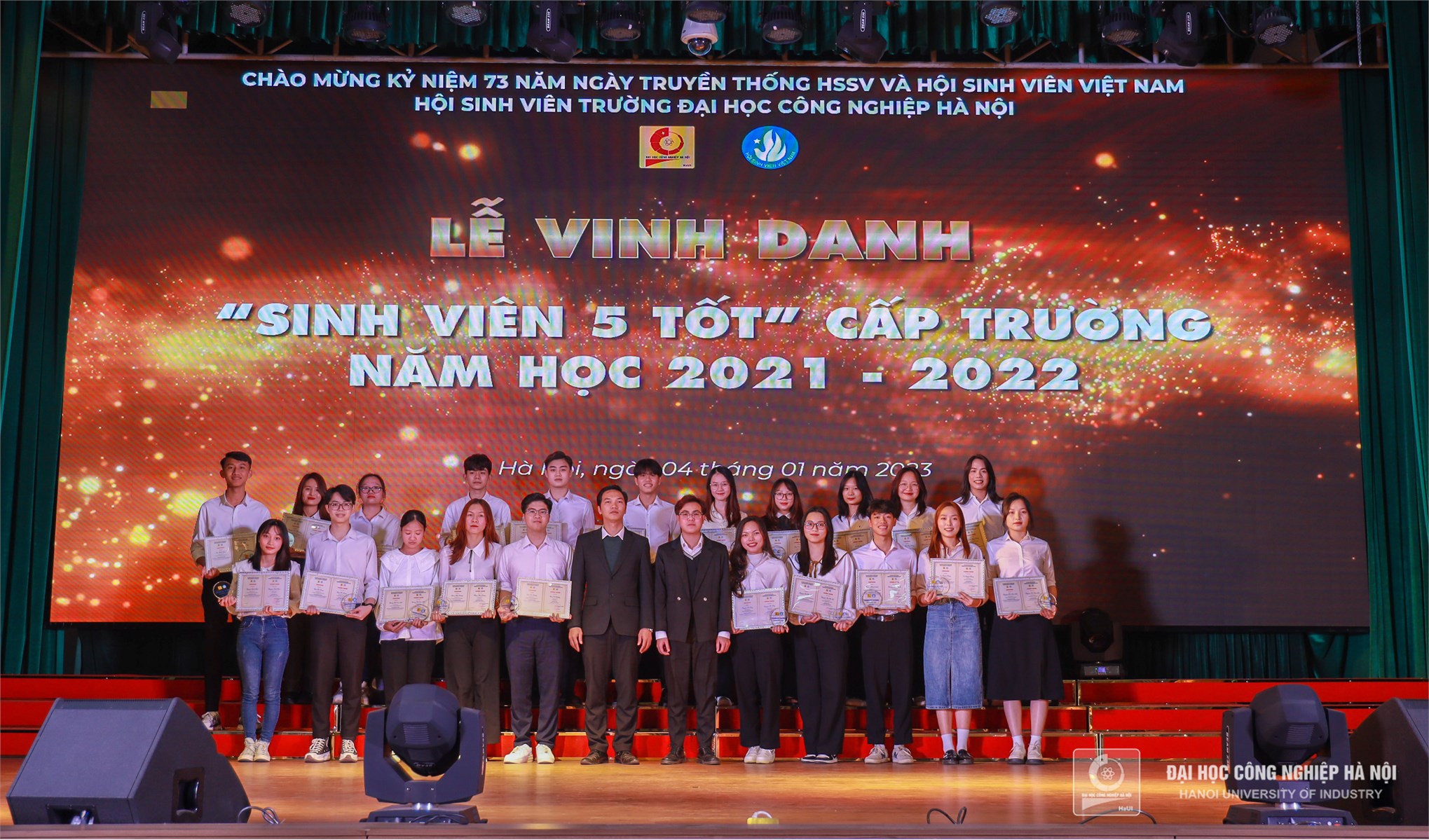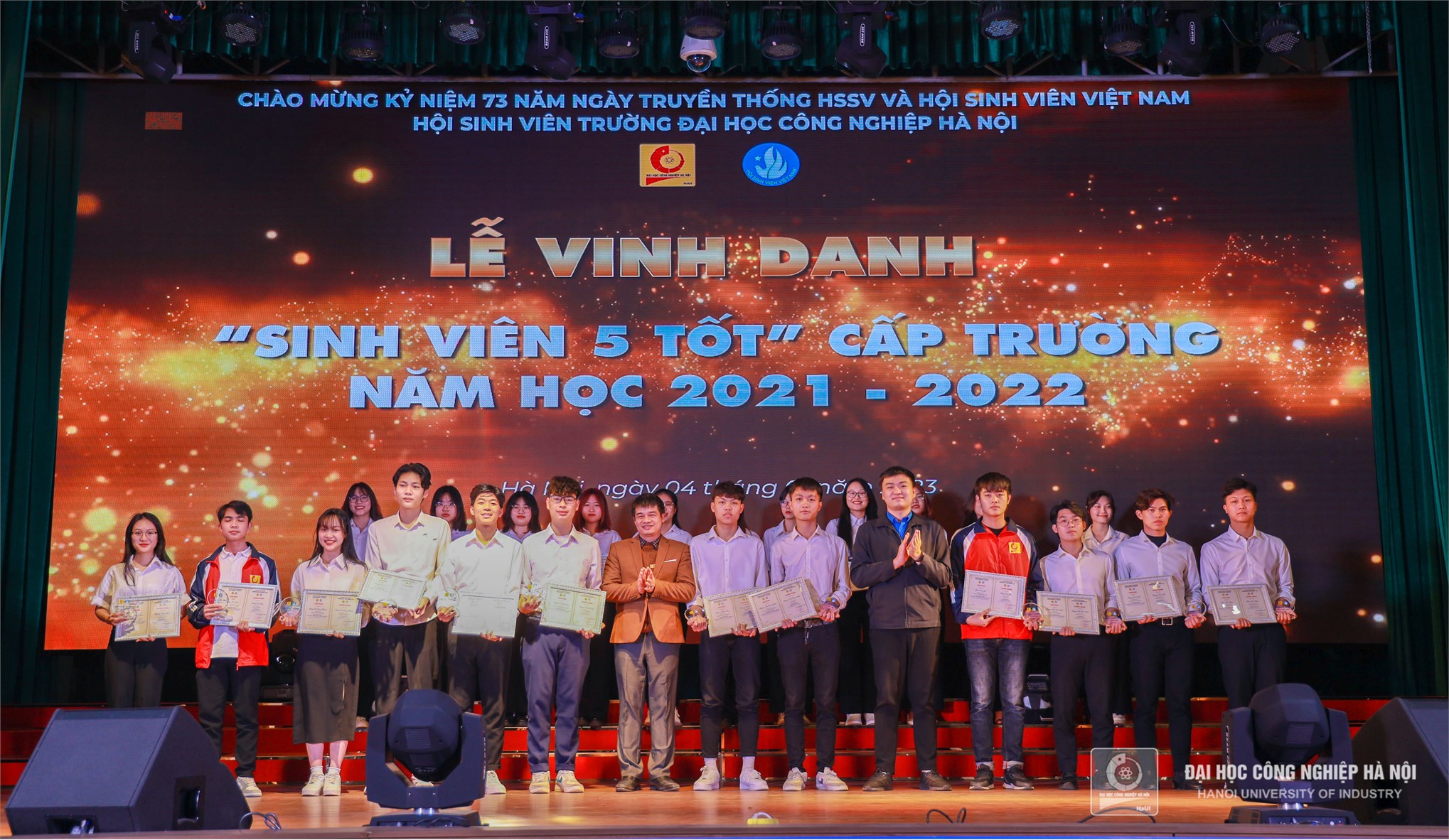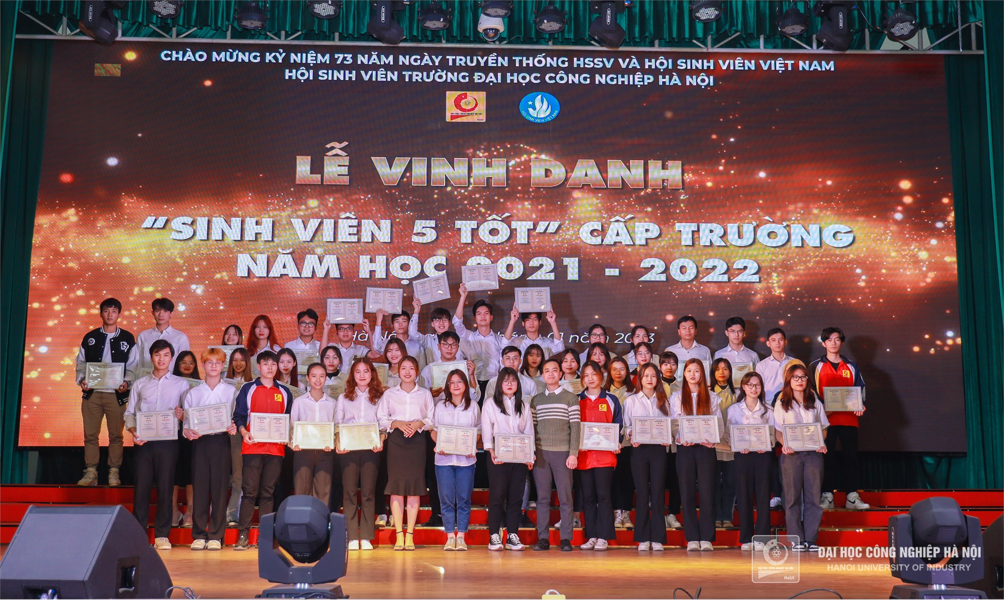 Trong khuôn khổ của Chương trình kỷ niệm, Hội Sinh viên trường đã tuyên dương 177 sinh viên 5 tốt cấp trường năm học 2021 – 2022 trong đó có 73 sinh viên 5 tốt cấp trường tiêu biểu. Đây là động lực để sinh viên tiếp tục tu dưỡng, rèn luyện và chinh phục hành trình tri thức của mình; đồng thời là minh chứng cho sự cố gắng và phát triển của sinh viên và Hội Sinh viên Trường Đại học Công nghiệp Hà Nội trong năm học vừa qua.