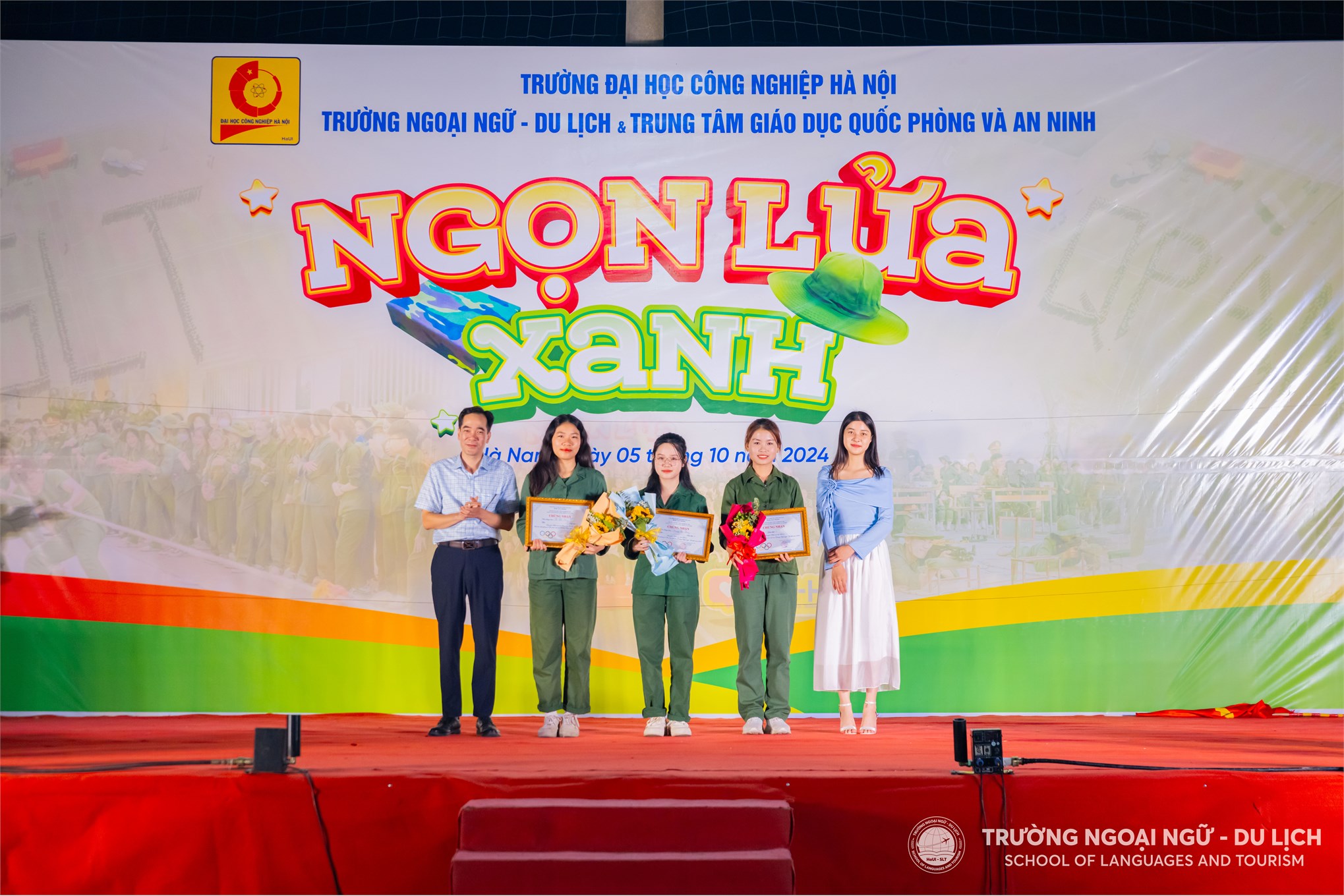 TS. Trần Ngọc Đức - Phó Hiệu trưởng Trường Ngoại ngữ - Du lịch và đồng chí Trần Thị Hương Giang - Phó Bí thư Đoàn Thanh niên, Chủ tịch Hội Sinh viên Trường Đại học Công nghiệp Hà Nội trao giải cho các vận động viên, đại đội đạt giải Nhất hội thao chào tân sinh viên
