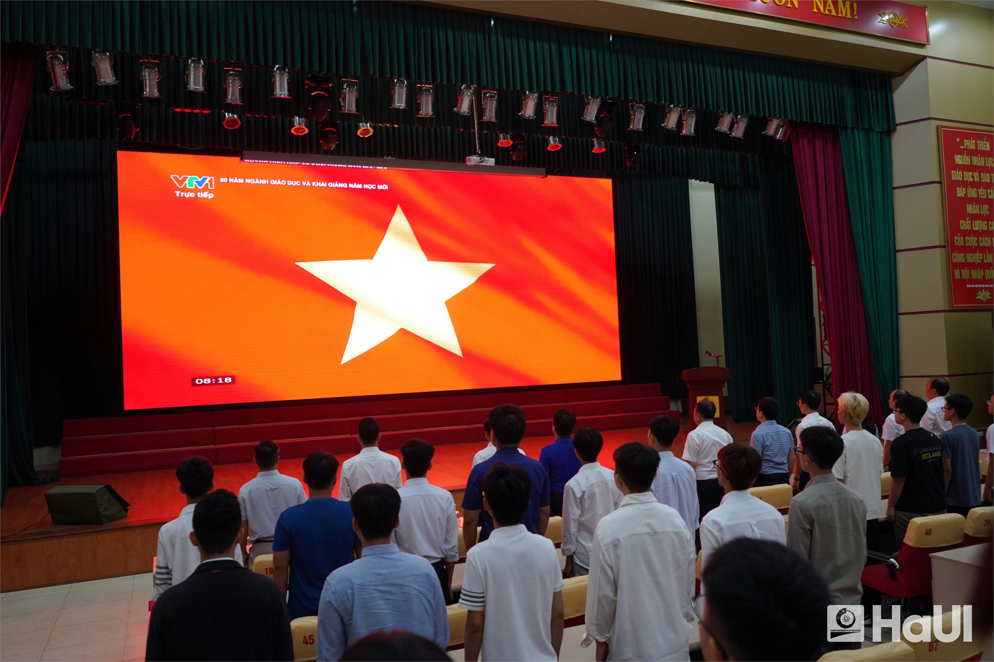 Trong khoảnh khắc trang trọng, ý nghĩa của ngày đầu năm học mới, hàng nghìn trái tim tân sinh viên HaUI đã cùng chung một nhịp đập khi hướng về màn hình lớn, nơi những giây phút kết nối đã thắp lên trong lòng mỗi tân sinh viên niềm tự hào dân tộc mãnh liệt, biến ngày tựu trường thành một sự kiện khởi đầu đầy ý nghĩa.