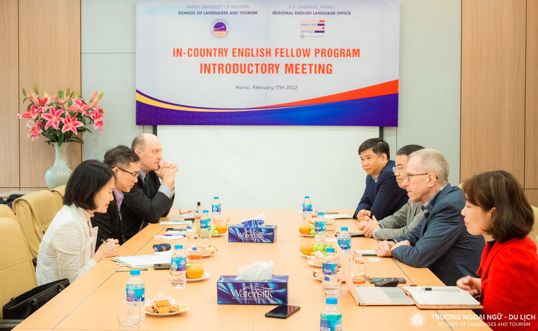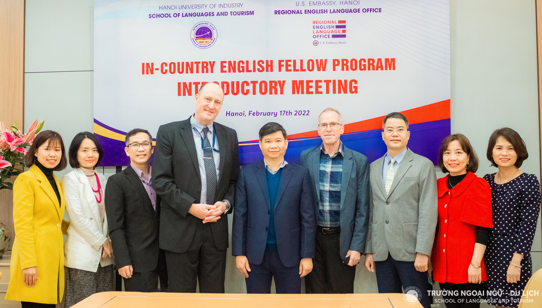 Về phía Văn phòng tiếng Anh khu vực (RELO Vietnam) có Ngài Jerrold Frank – Giám đốc Văn phòng, ông Lê Thuỳ Dương – Phó giám đốc Văn phòng, bà Nguyễn Hạnh – Giám đốc chương trình Đào tạo trực tuyến, ông John Niblett – chuyên gia Anh ngữ. Về phía Trường Ngoại ngữ Du lịch, đón tiếp đoàn chuyên gia có TS. Hoàng Ngọc Tuệ - Hiệu trưởng Trường Ngoại ngữ - Du lịch, TS. Nguyễn Thị Hương – Điều phối viên dự án.