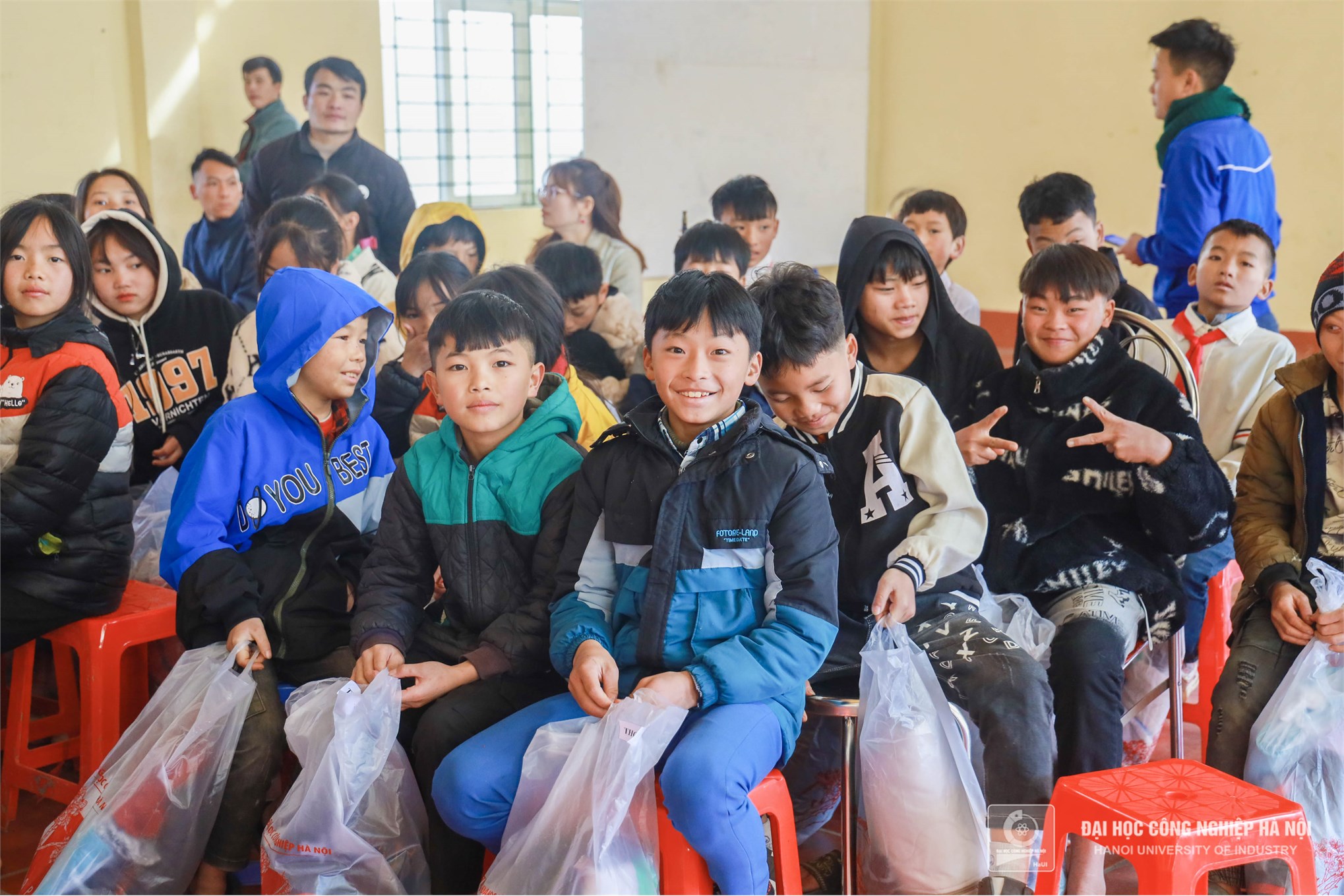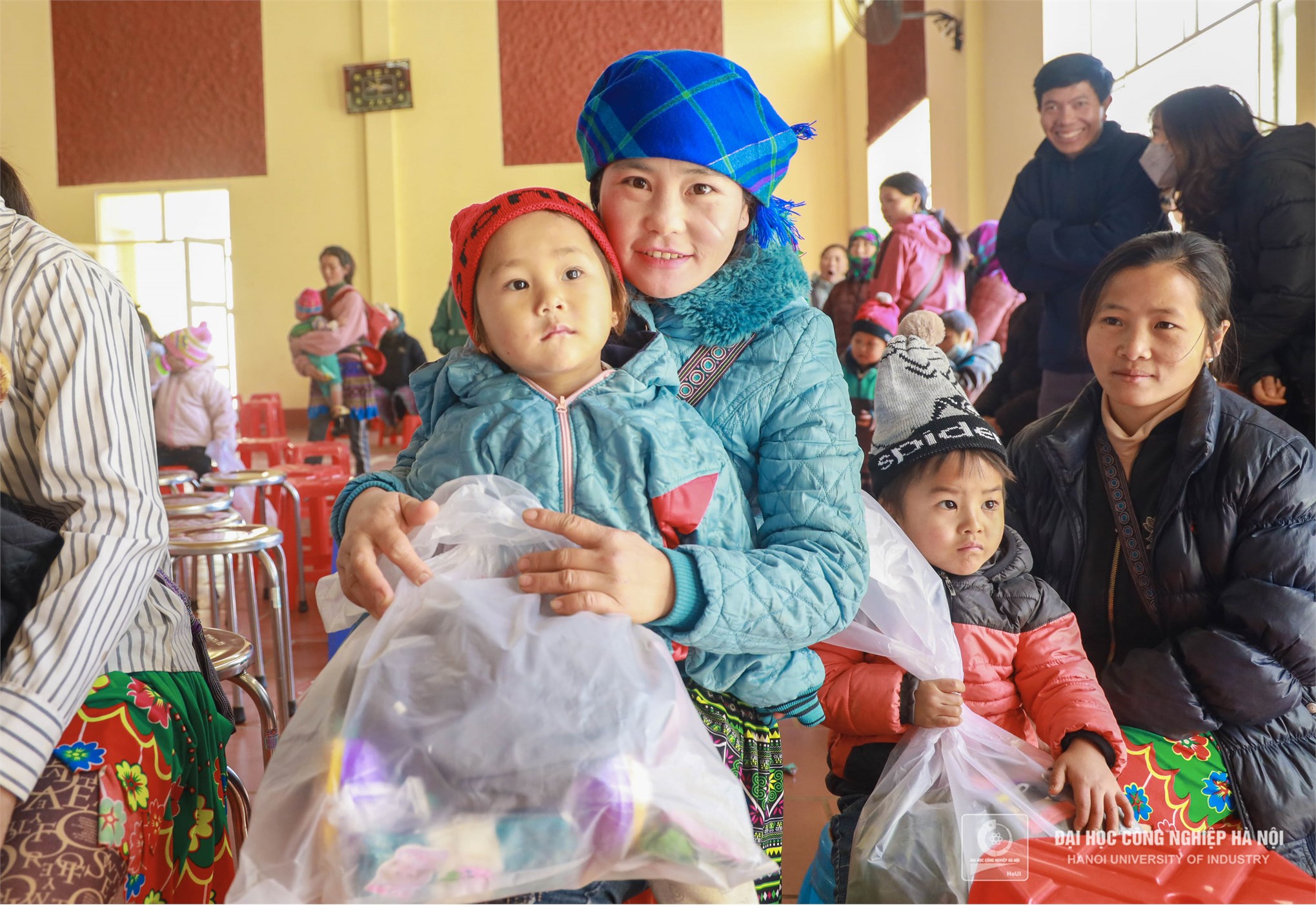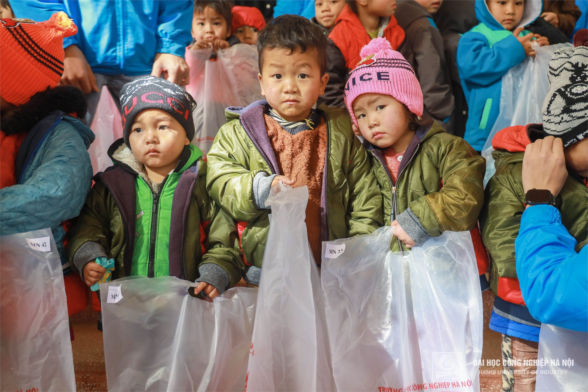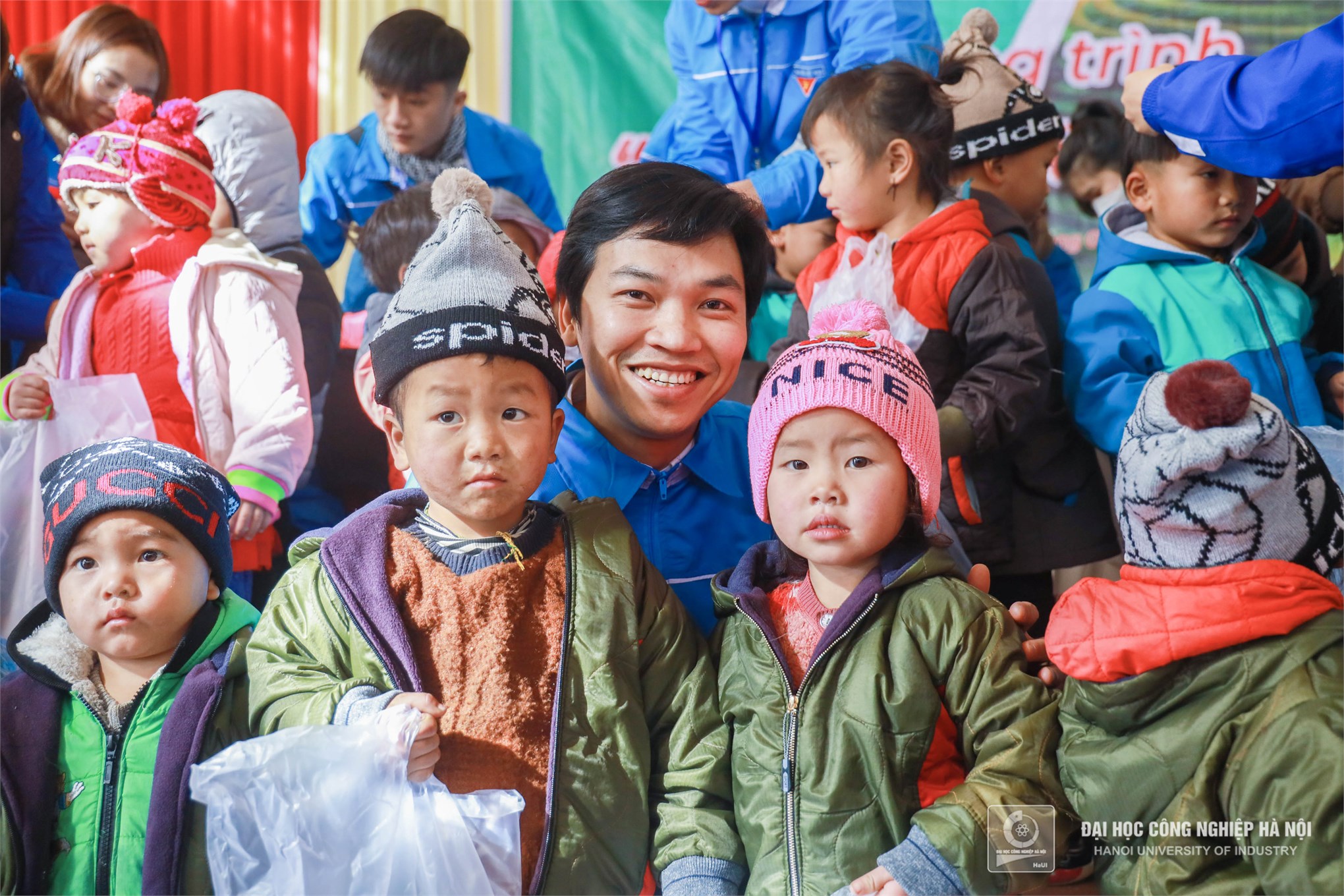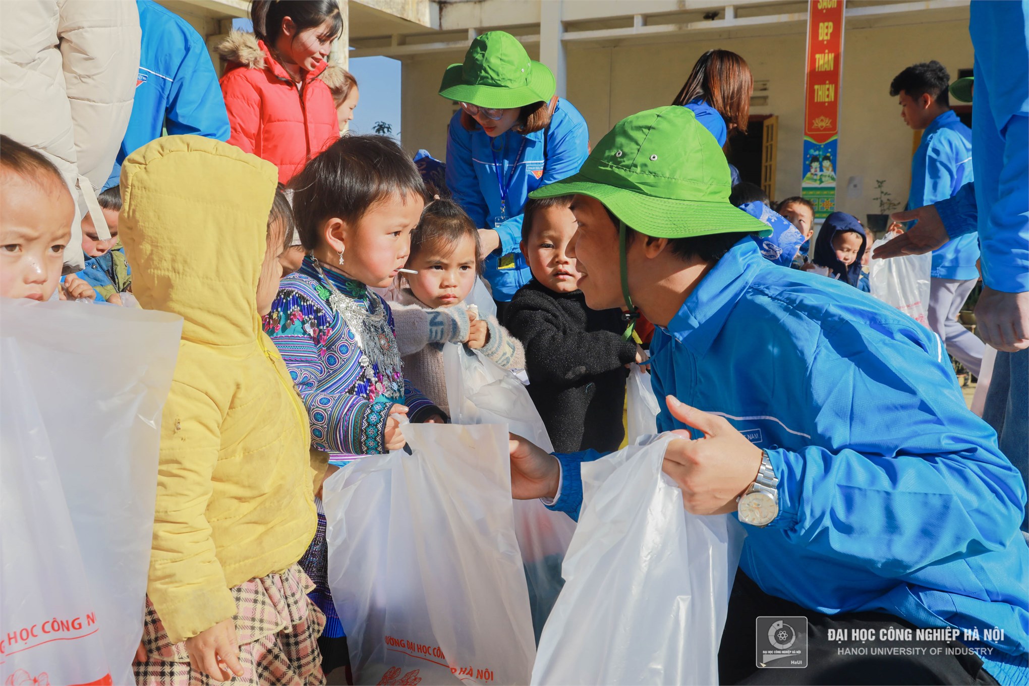 Màu áo xanh tình nguyện Trường Đại học Công nghiệp Hà Nội mang đến những món quà, những chiếc áo ấm thiết thực sẽ phần nào sưởi ấm, giúp cho cuộc sống của các em bớt gian nan hơn trong mùa đông giá