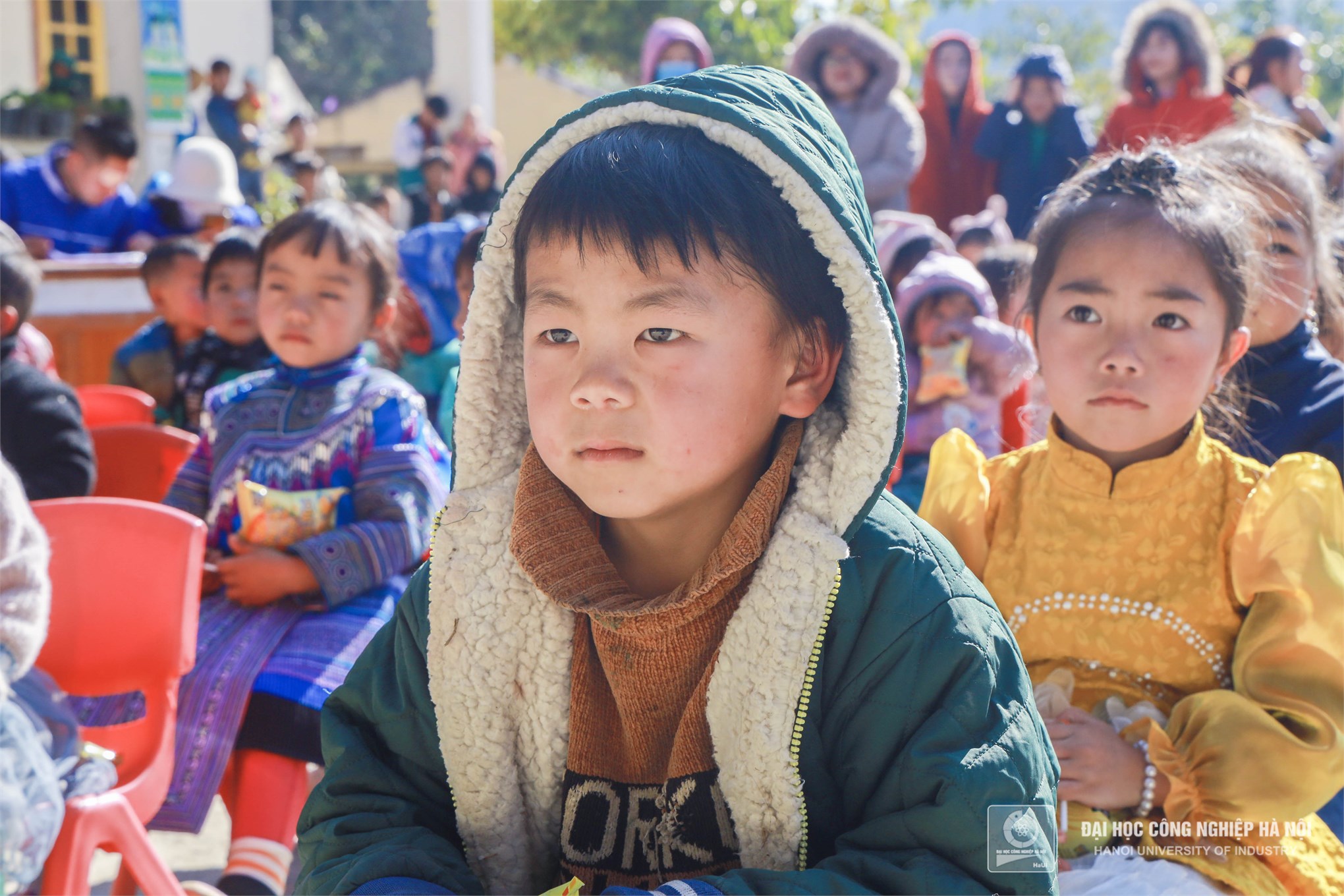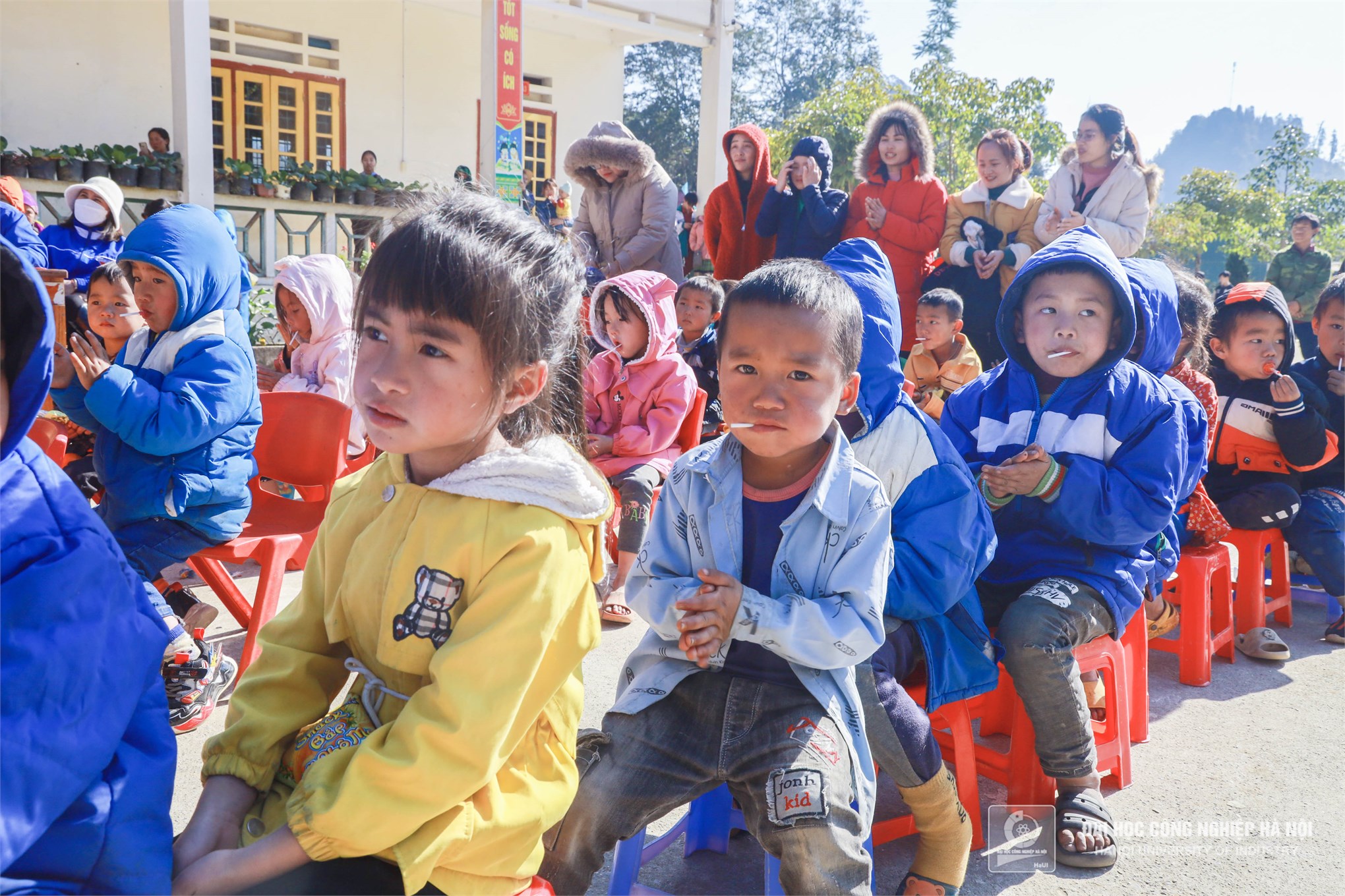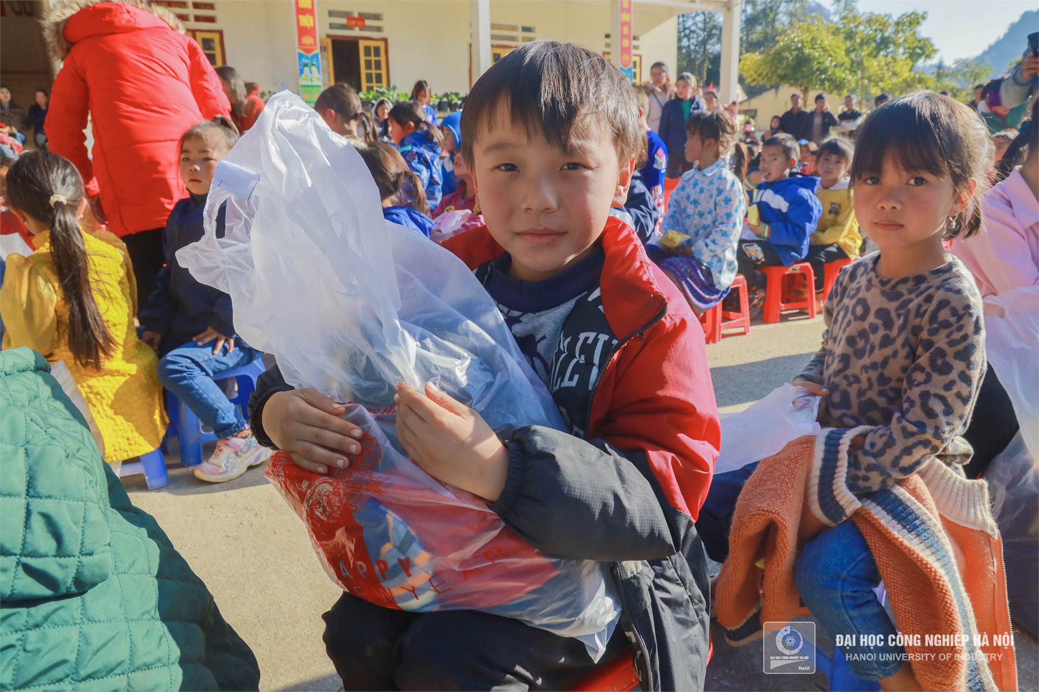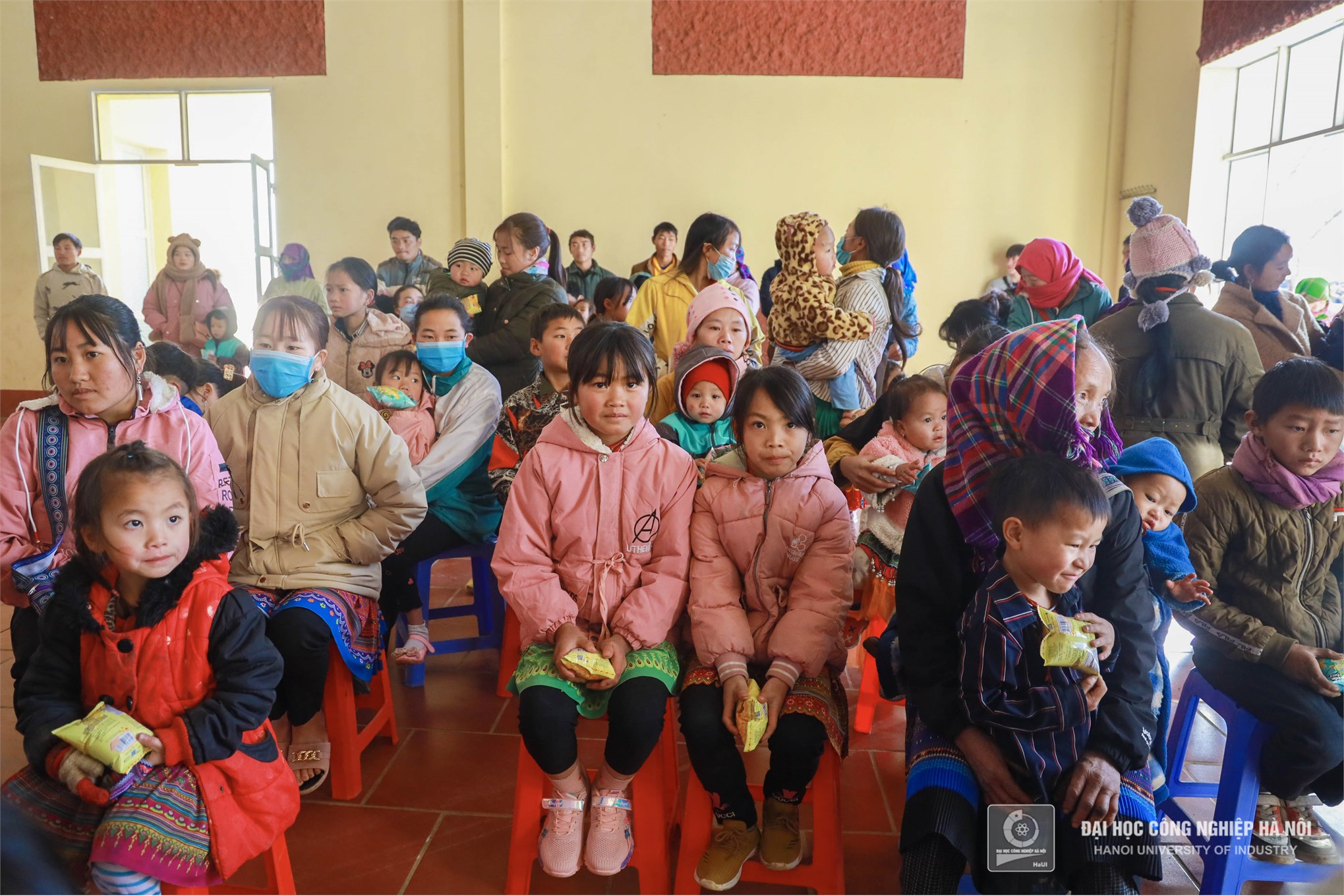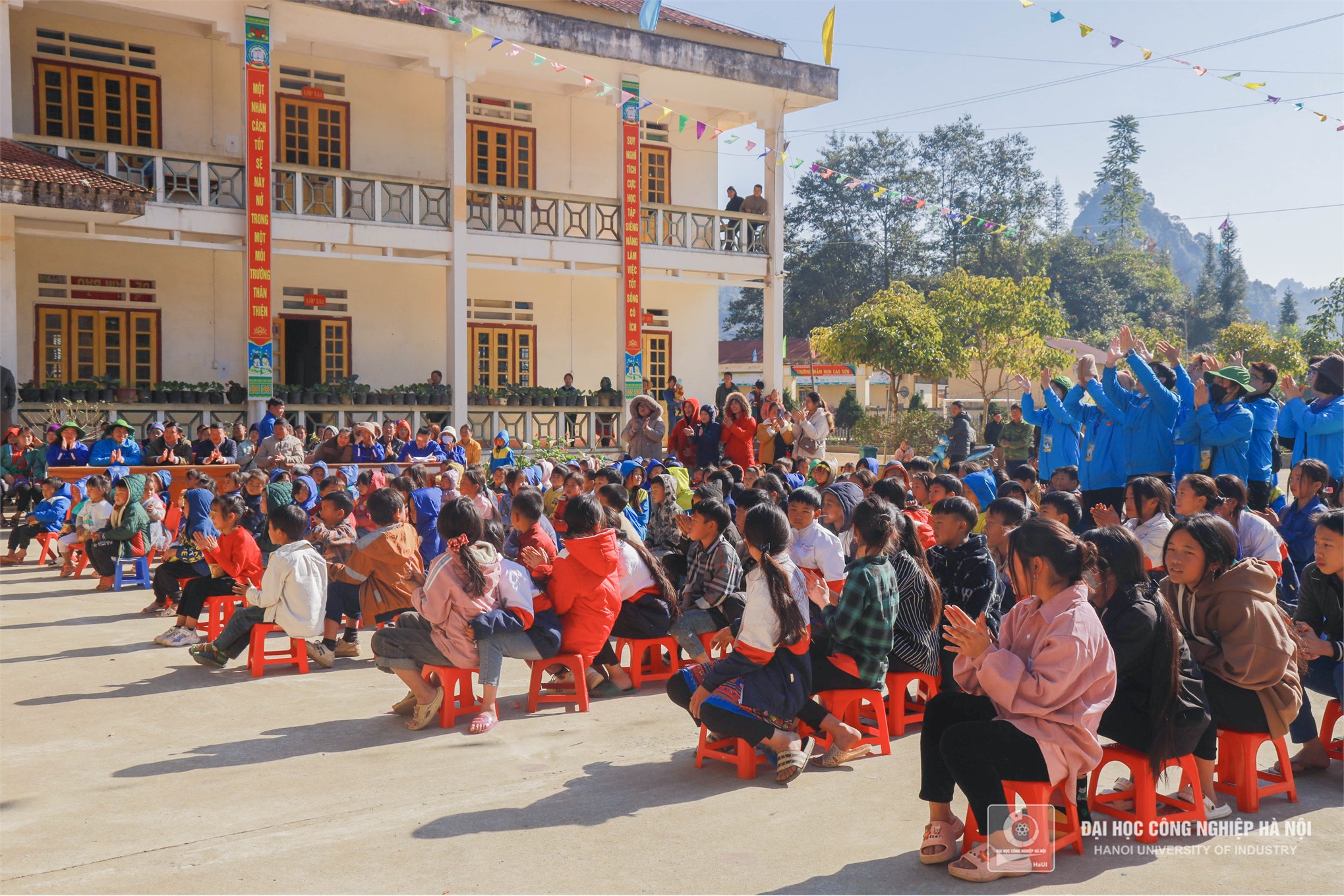 Màu áo xanh tình nguyện Trường Đại học Công nghiệp Hà Nội mang đến những món quà, những chiếc áo ấm thiết thực sẽ phần nào sưởi ấm, giúp cho cuộc sống của các em bớt gian nan hơn trong mùa đông giá