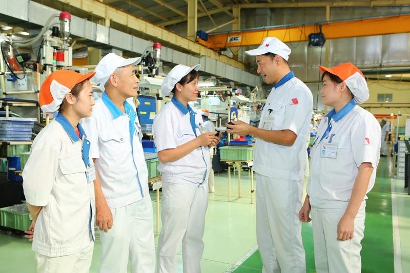 Chuyên gia Nhật Bản hướng dẫn nhân viên kỹ thuật tại Công ty TNHH Yokoi Mould Việt Nam, Khu công nghiệp Đình Trám, huyện Việt Yên (Bắc Giang). Ảnh: THÀNH ĐẠT