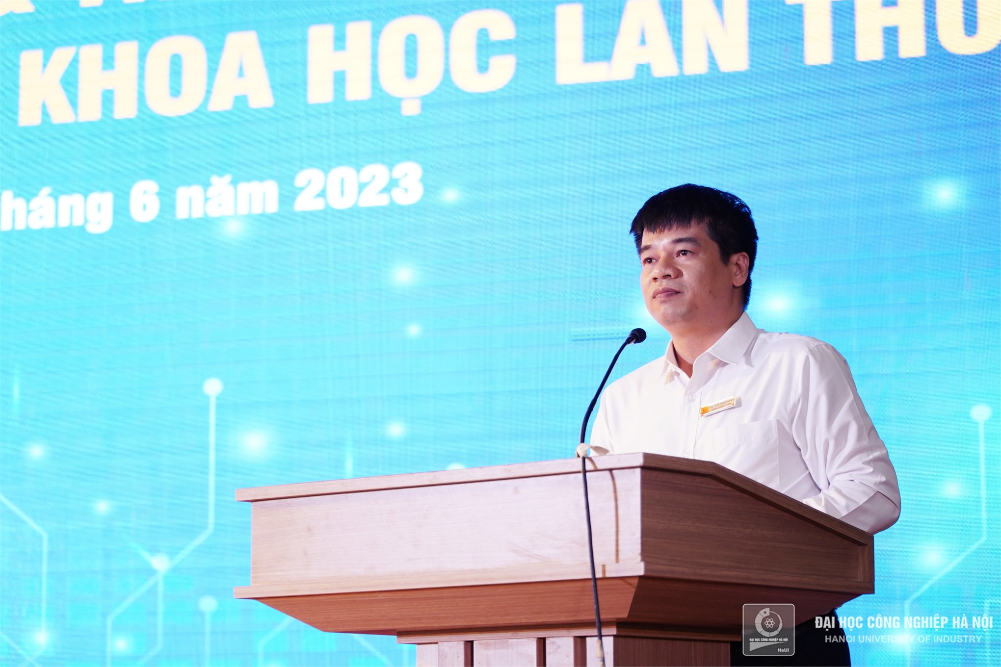 PGS.TS. Vũ Minh Tân - Phó Trưởng phòng Khoa học công nghệ, trình bày báo cáo, trong đó nhấn mạnh: để góp phần hình thành năng lực tự học, tự nghiên cứu cho sinh viên, nhà trường từng bước xây dựng môi trường sáng tạo, tạo điều kiện cho sinh viên trong trường tham gia các hoạt động nghiên cứu khoa học ở quy mô cấp trường, cấp khu vực, cấp quốc gia và quốc tế. Thông qua các sân chơi học thuật uy tín, nhà trường tiếp tục phát hiện, bồi dưỡng những ý tưởng, giải pháp sáng tạo, đóng góp giải quyết những vấn đề thực tiễn và phục vụ cộng đồng.