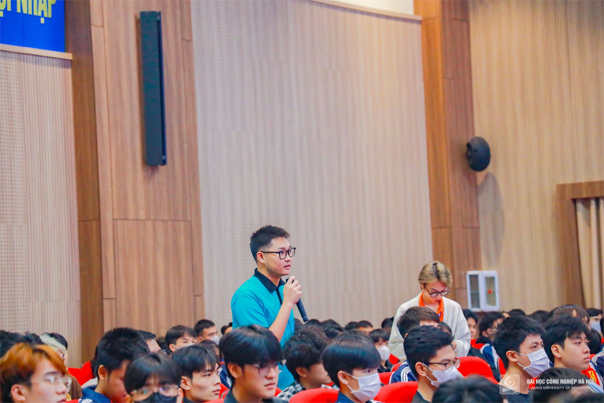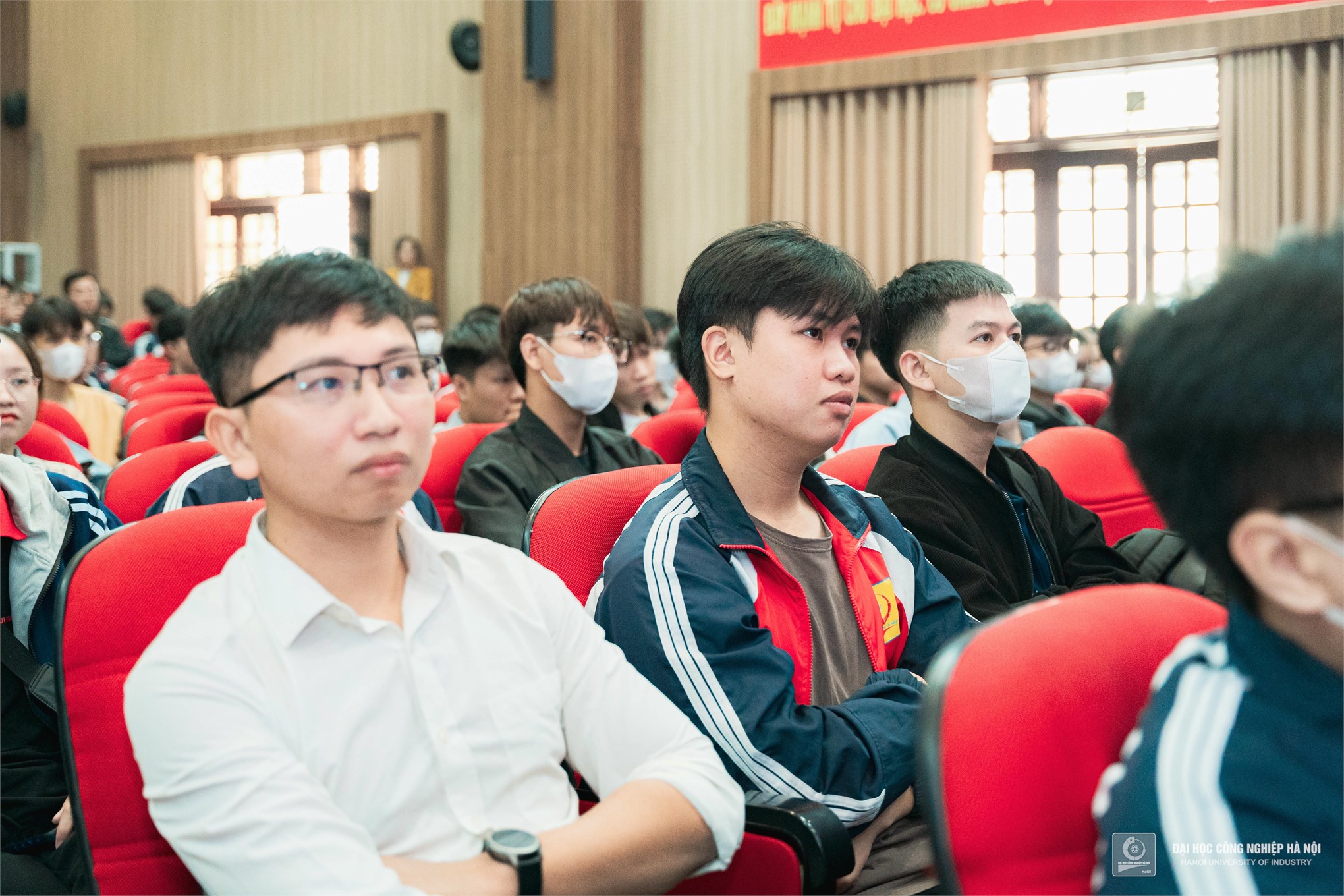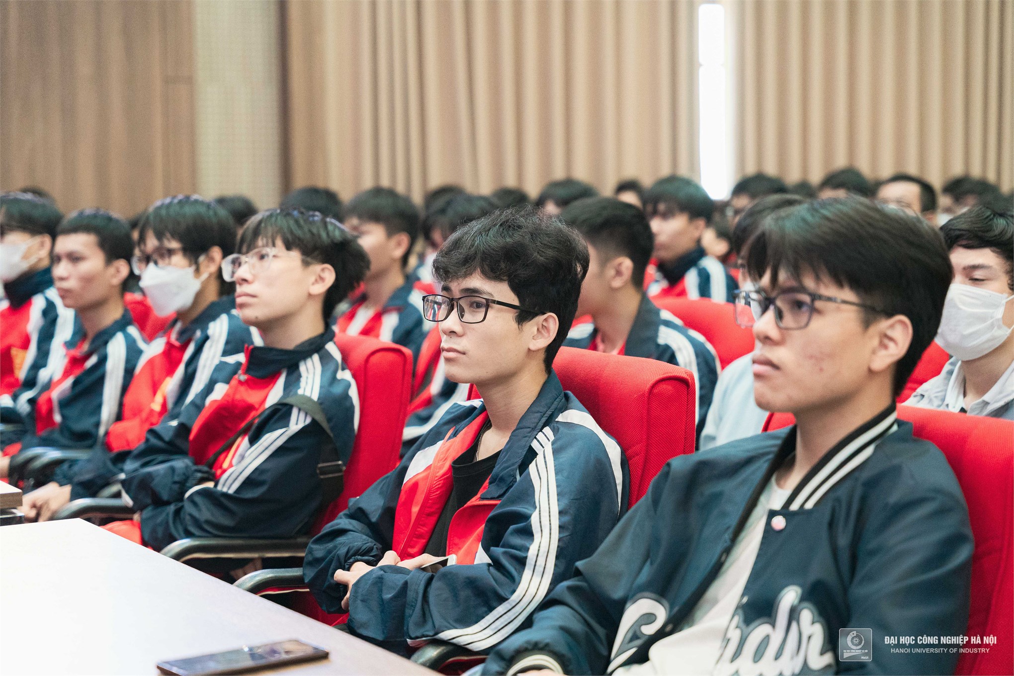 Sinh viên chăm chú dõi theo bài nói chuyện của các chuyên gia tại chương trình