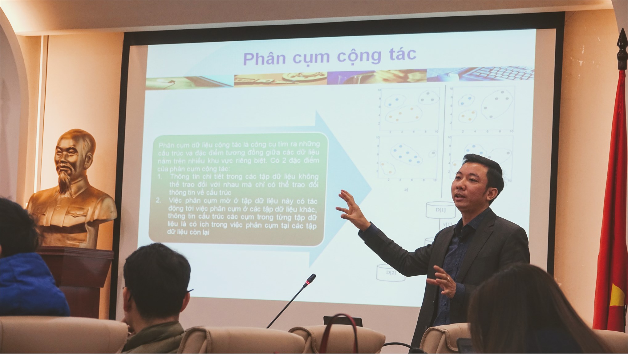 TS. Đặng Trọng Hợp - Phụ trách khoa CNTT trình bày chuyên đề “Phân cụm ảnh vệ tinh siêu phổ bằng thuật toán phân cụm mờ cộng tác và giảm chiều dữ liệu theo phép chiếu ngẫu nhiên”