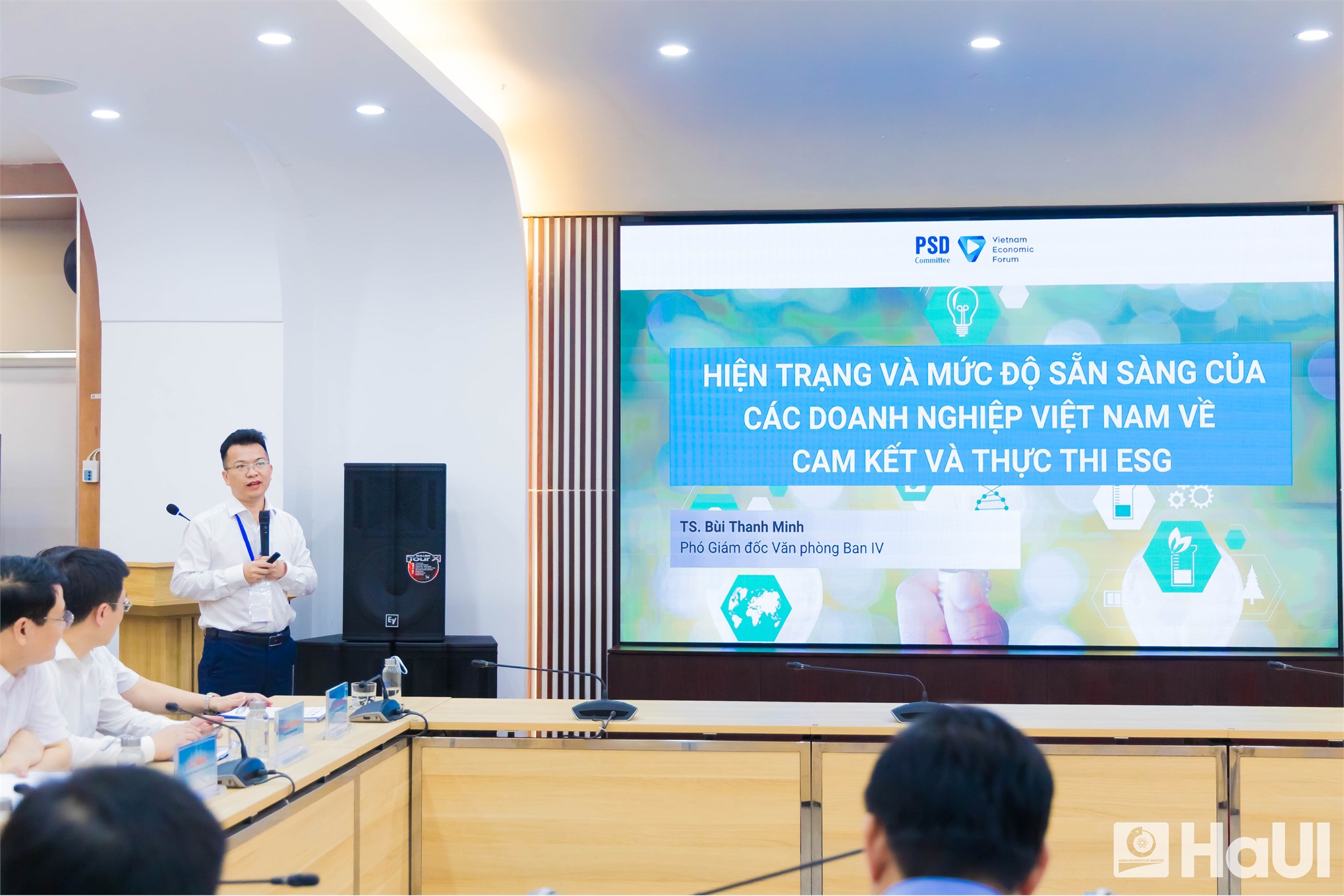 TS. Bùi Thanh Minh, Phó Giám đốc Văn phòng Ban Nghiên cứu phát triển kinh tế tư nhân trình bày tại Hội thảo: Hiện trạng và mức độ sẵn sàng của các DN Việt Nam về cam kết và thực thi ESG