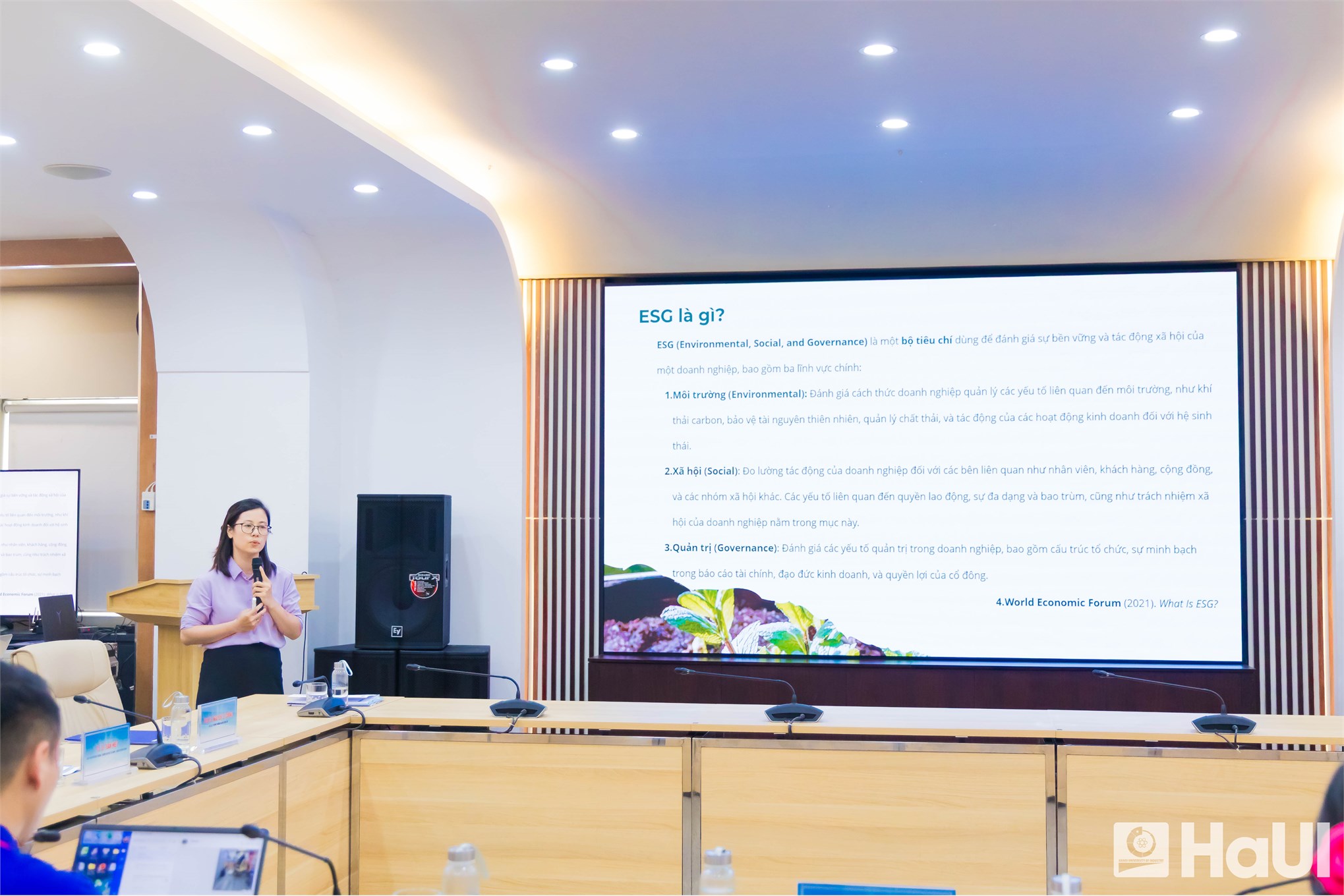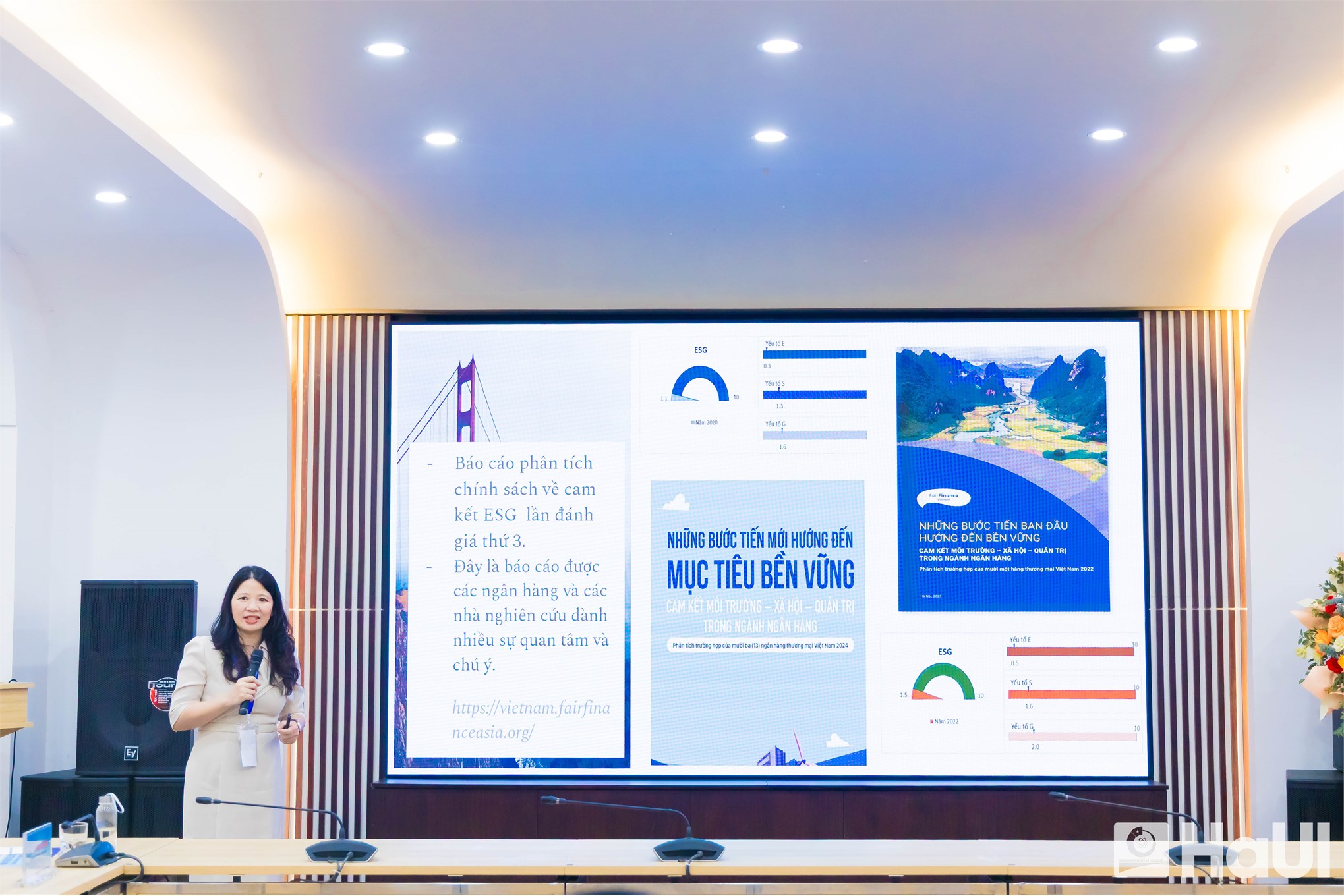 TS. Bùi Thị Thu Loan, Trưởng Khoa Tài chính, Trường Kinh tế, thuộc HaUI trình bày chủ đề: Những bước tiến mới trong cam kết chính sách ESG của các NHTM Việt Nam