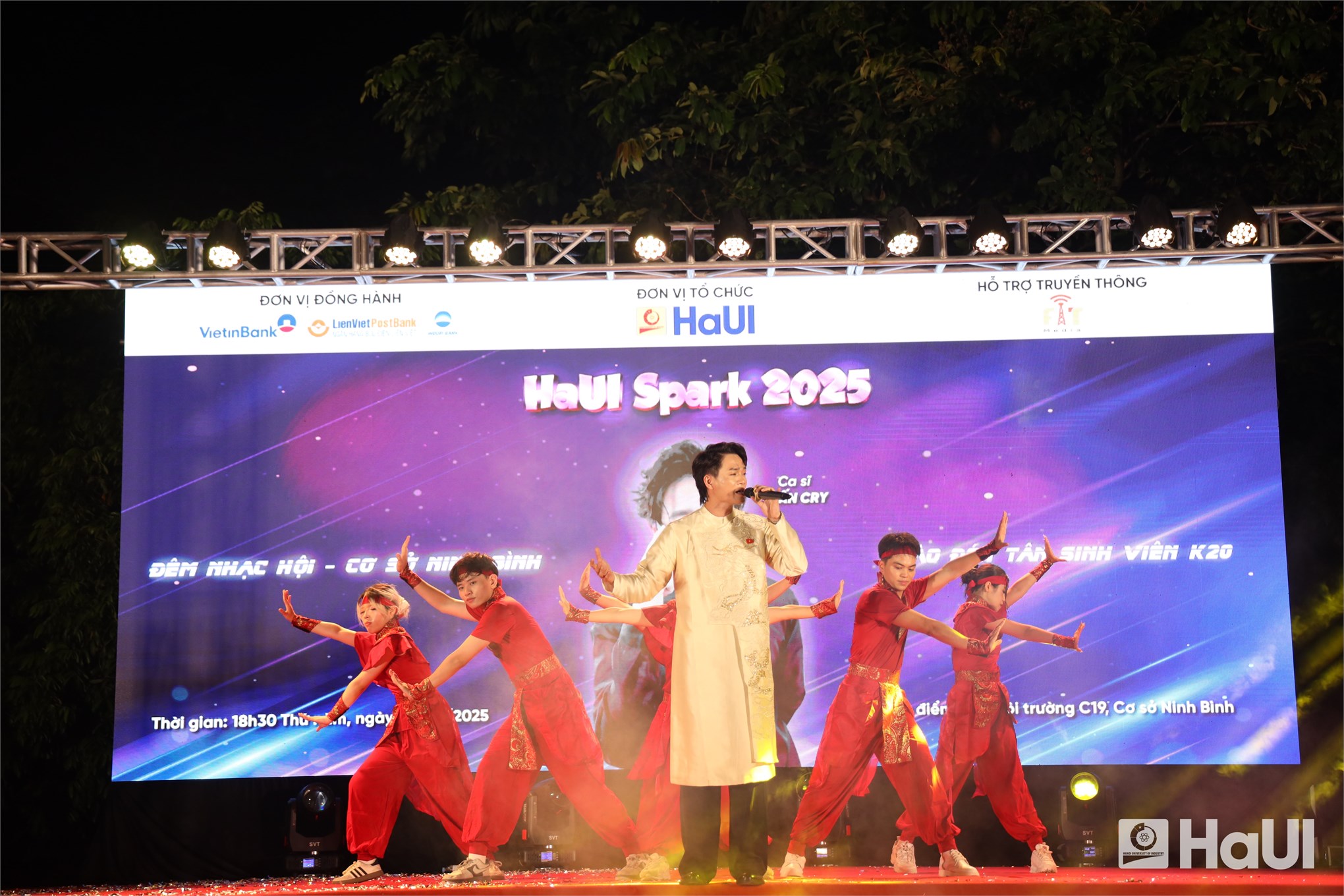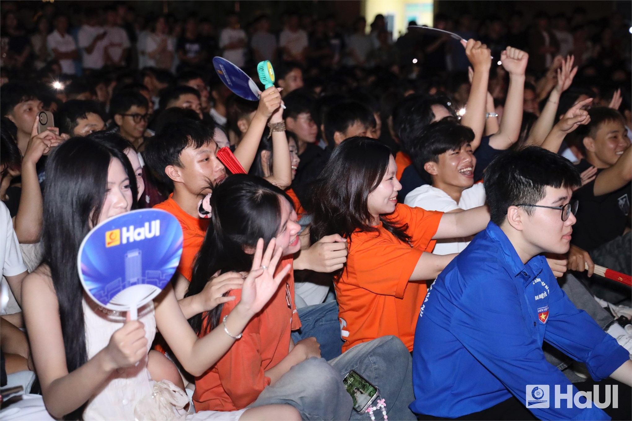 Tối cùng ngày, không khí chào tân tiếp tục bùng nổ với HaUI SPARK 2025 – đêm đại nhạc hội thắp sáng năm học mới bằng một bữa tiệc âm nhạc và ánh sáng rực rỡ với chuỗi mashup sôi động, vũ đạo bùng nổ, ballad cảm xúc và những phần trình diễn bất ngờ.