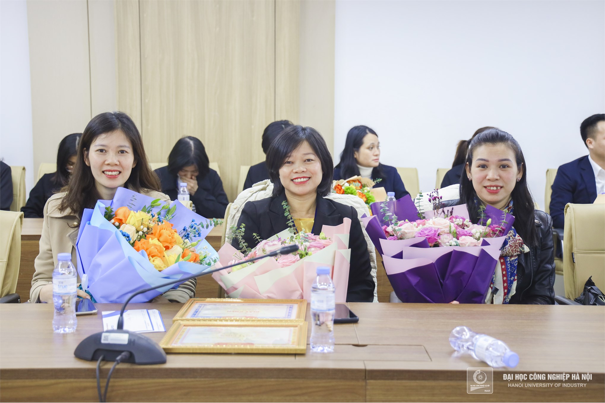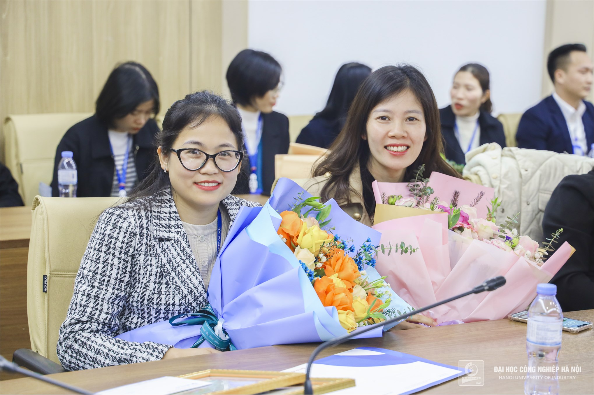 Ông Nguyễn Quang Trung - Giám đốc Công ty LETCO và ông Nguyễn Văn Thiện - Trưởng phòng Tổ chức Hành chính HaUI, thành viên Hội đồng thành viên Công ty LETCO trao thưởng cho cán bộ tuyển sinh hoàn thành vượt mức kế hoạch năm 2023