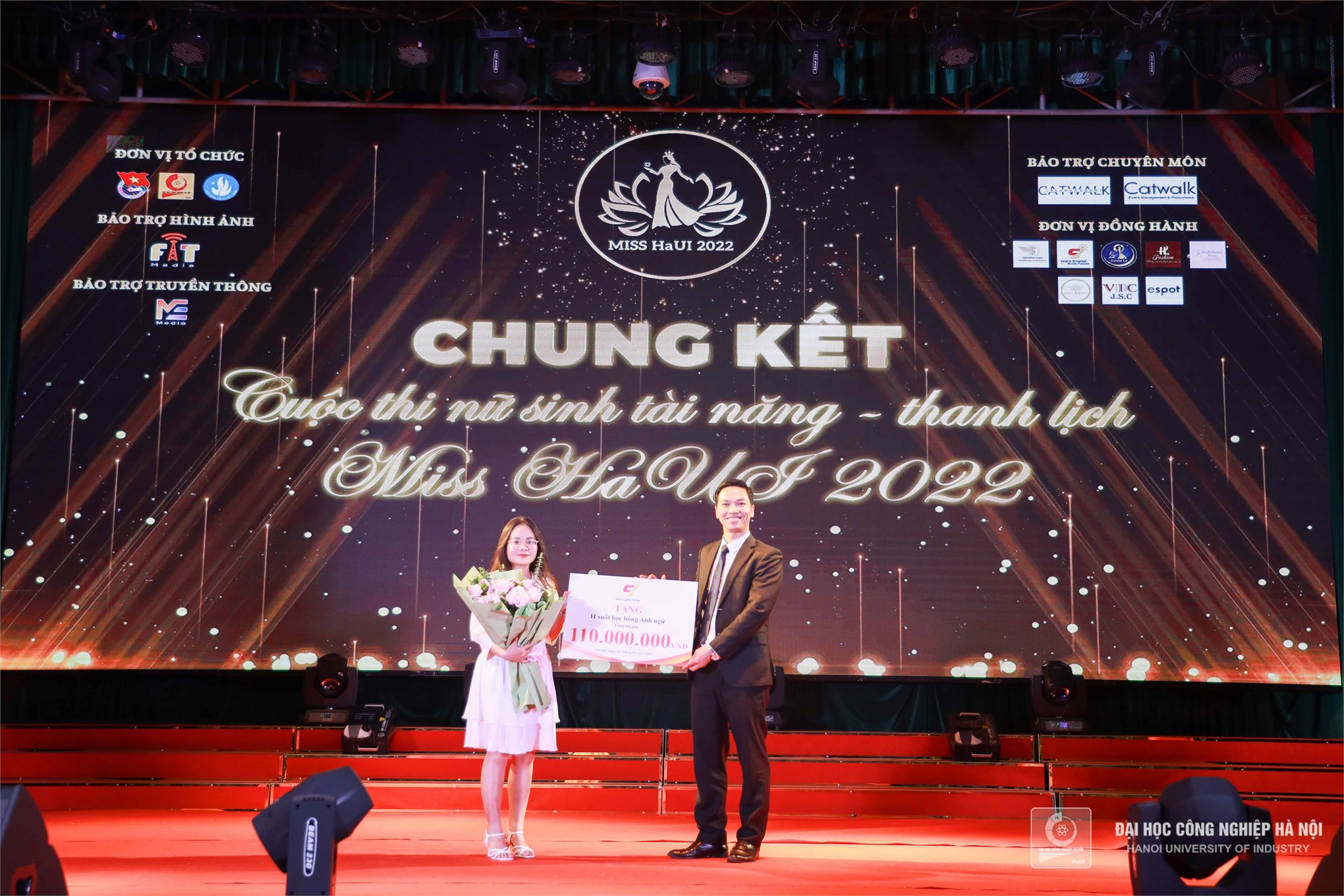 TS.Nguyễn Văn Thiện - Phó Hiệu trưởng Nhà trường và Đồng chí Nguyễn Tiến Hưng, UVBCH Trung ương Đoàn, Phó Chủ tịch Hội Sinh viên Việt Nam, Phó Bí thư Thành đoàn, Chủ tịch Hội Sinh viên Việt Nam thành phố Hà Nội trao giải cho Á khôi 1 - Nguyễn Thị Thu Huyền - Khoa Quản lý Kinh doanh