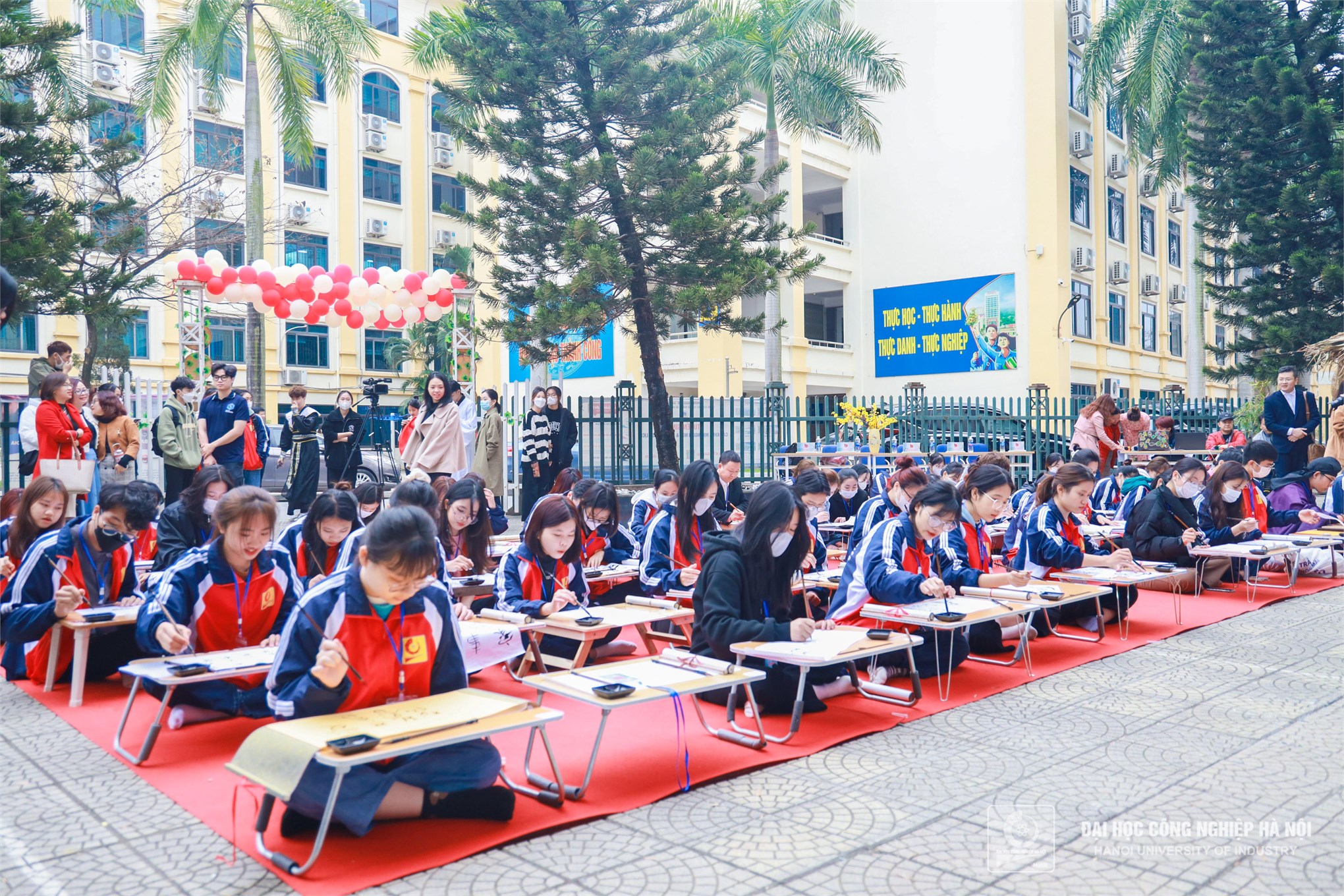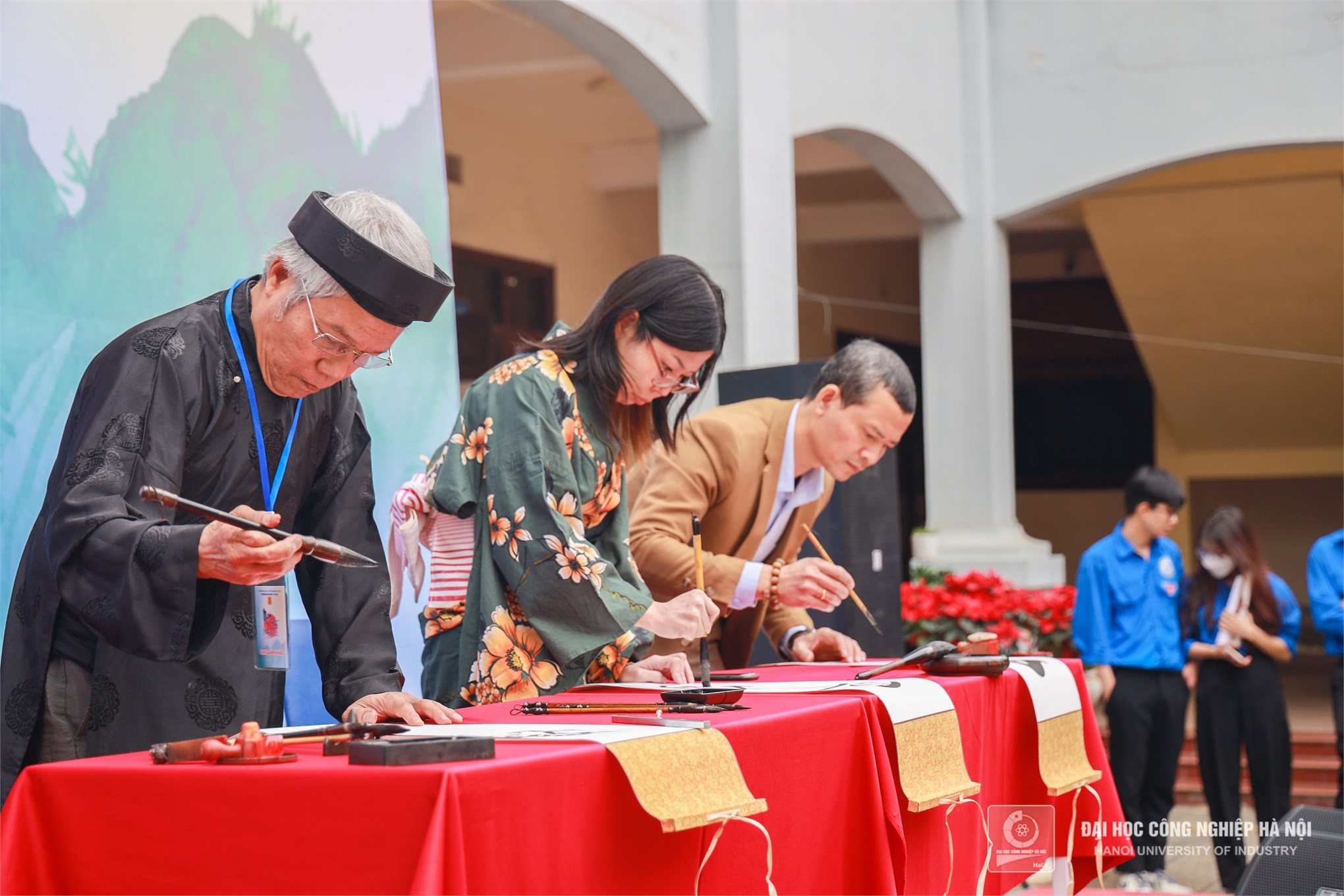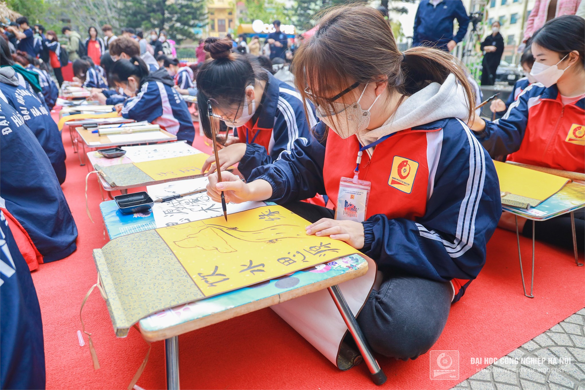 Trong không gian ngập tràn hương sắc của mùa xuân, gần 100 sinh viên từ các đơn vị đào tạo thuộc Trường Đại học Công nghiệp Hà Nội thả hồn, trao tâm thảo những nét chữ thư pháp. Nghiên sầu thơm thảo hòa vào từng nét bút, nét chữ uốn lượn trên những mực tàu giấy đỏ. Xuyên suốt cả một chiều dài lịch sử, nét văn hóa ấy vẫn được duy trì và phát triển cho đến ngày nay.