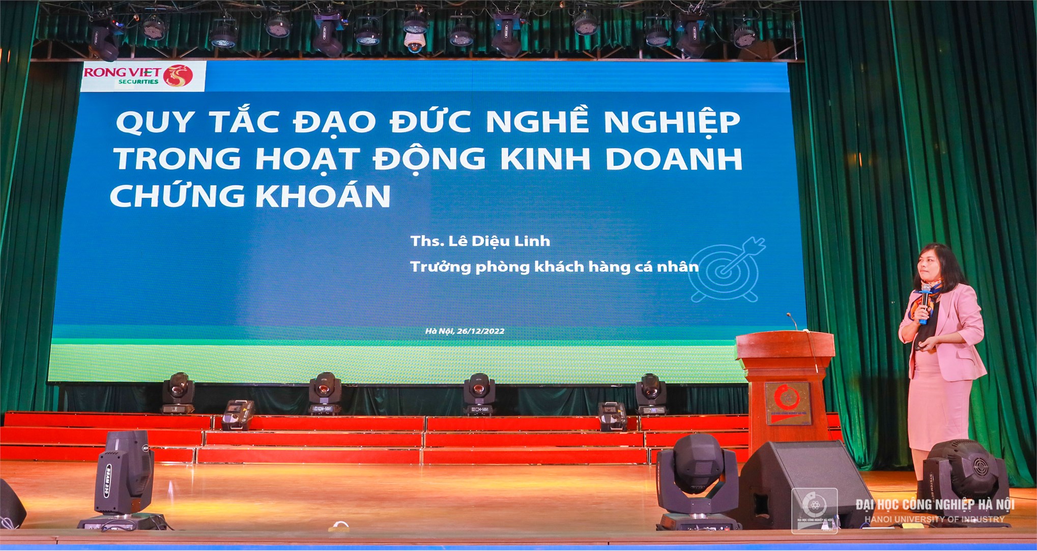 Diễn giả Lê Diệu Linh, Trưởng phòng Khách hàng cá nhân, Công ty chứng khoán Rồng Việt chia sẻ với chủ đề “Quy tắc đạo đức nghề nghiệp trong hoạt động kinh doanh chứng khoán”