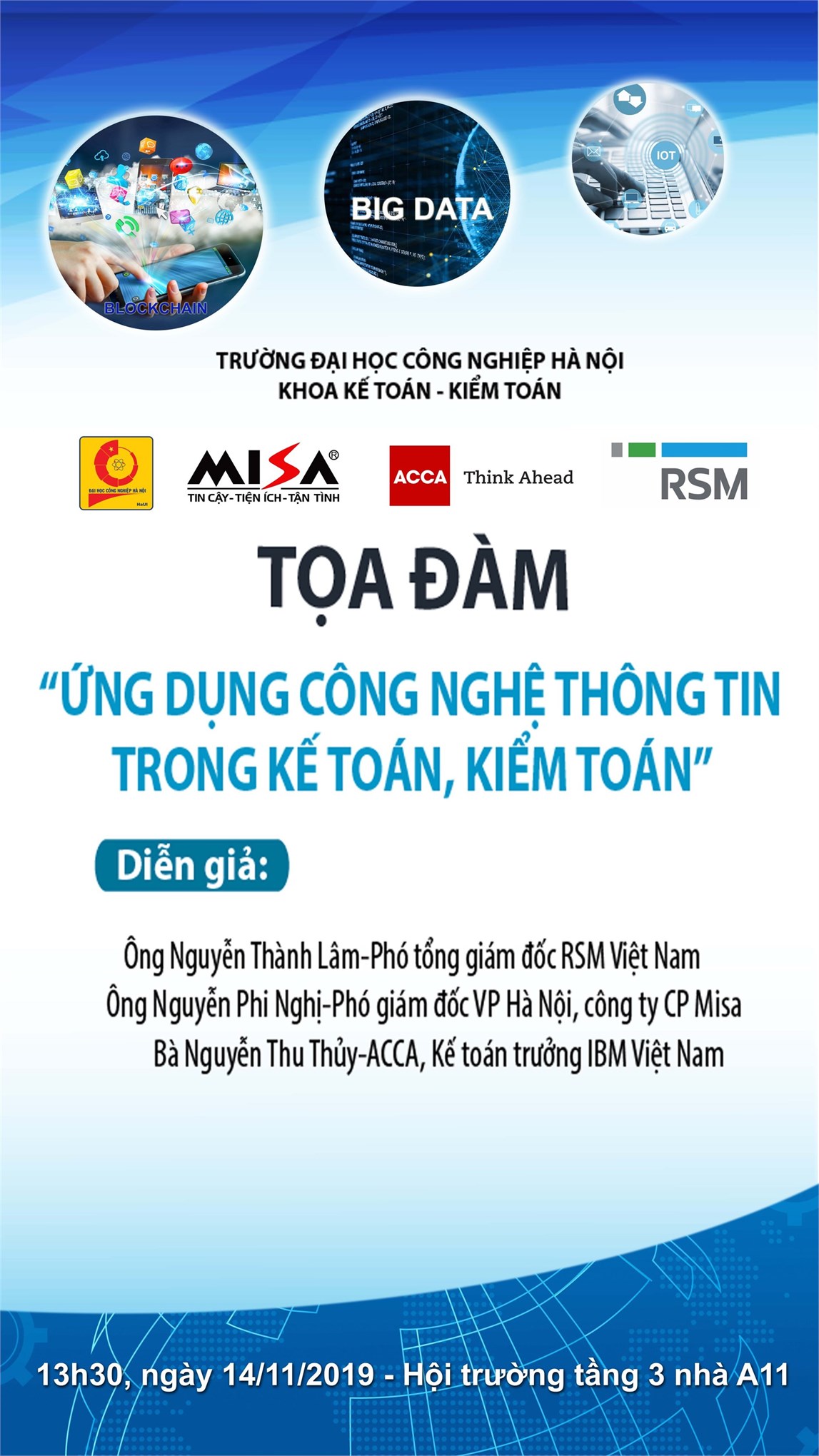 Khoa Kế toán Kiểm toán-HaUI lập kế hoạch tọa đàm "Ứng dụng công nghệ thông tin trong Kế toán Kiểm toán" vào 13h30 ngày 14 tháng 11 năm 2019, các diễn giả của chương trình là các chuyên gia trong lĩnh vực Kế toán, Kiểm toán đang làm việc tại các công ty có ứng dụng công nghệ thông tin, kĩ thuật số cao trong các hoạt động quản lý. Đặc biệt IBM là một trong những tập đoàn hàng đầu trên thế giới cung cấp các sản phẩm về CNTT như Đám mây, cơ sở hạn tầng CNTT, Bảo mật, Internet vạn vật, chuyển đổi kĩ thuật số, phần mềm,...