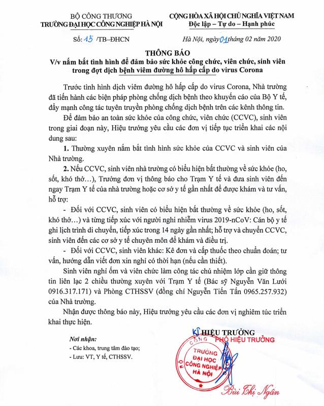 Thông báo v/v nắm bắt tình hình để đảm bảo sức khỏe công chức, viên chức, sinh viên trong đợt dịch bệnh viêm đường hô hấp cấp do virus Corona