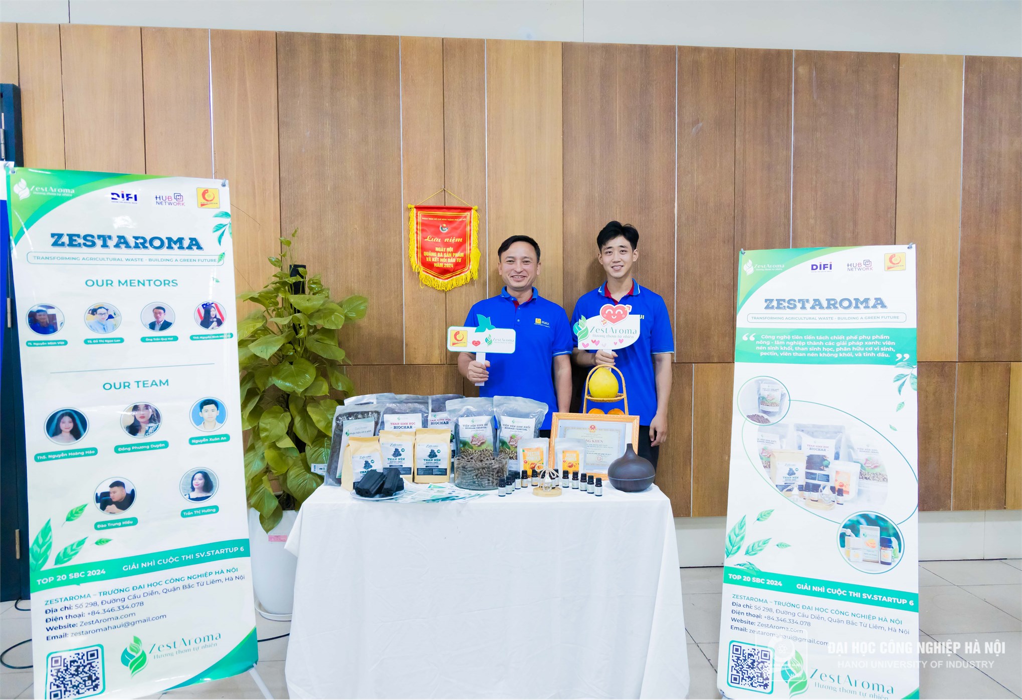 Dự án ZesAroma của thầy và trò trường Đại học Công nghiệp Hà Nội cũng được trưng bày tại Hội thảo. Với sản phẩm chủ lực là viên nén sinh khối, cùng các sản phẩm phụ trợ từ phế phẩm nông - lâm nghiệp như than sinh học, than nén không khói, tinh dầu và pectin, những giải pháp thiết thực của ZestAroma không chỉ góp phần thúc đẩy kinh tế tuần hoàn, bảo vệ môi trường mà còn thể hiện trách nhiệm xã hội, khẳng định cam kết của nhóm trong việc tạo ra giá trị tích cực cho cộng đồng