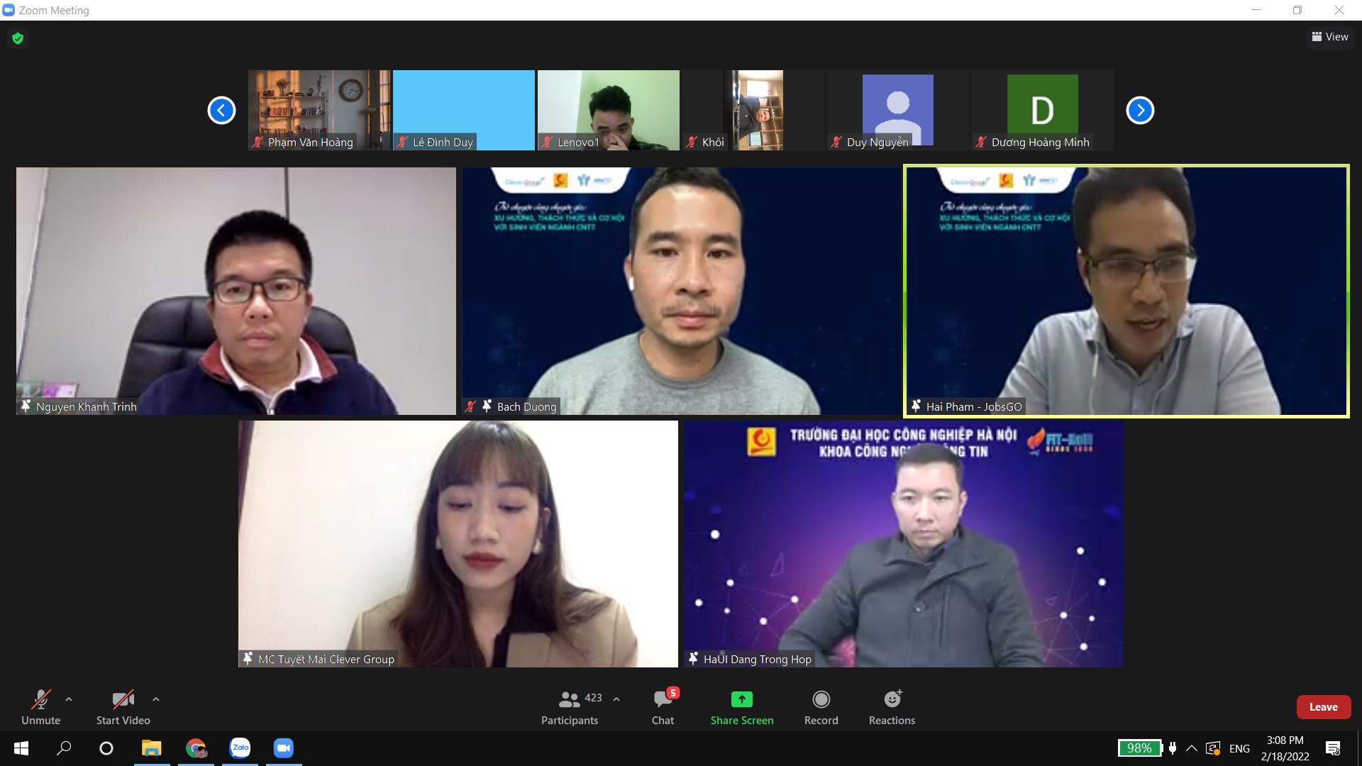 Trong khuôn khổ dự án “Cải tiến việc dạy và học CNTT nhằm nâng cao tỷ lệ đạt chuẩn đầu ra tại Trường Đại học Công Nghiệp Hà Nội”, tối ngày 18/2/2022 đã diễn ra buổi toạ đàm trực tuyến dành cho sinh viên CNTT Trường ĐH Công Nghiệp Hà Nội về chủ đề “Xu hướng, Thách thức và Cơ hội với sinh viên ngành CNTT” với sự tham gia của diễn giả đại diện đến từ tập đoàn Clever Group và JobsGO