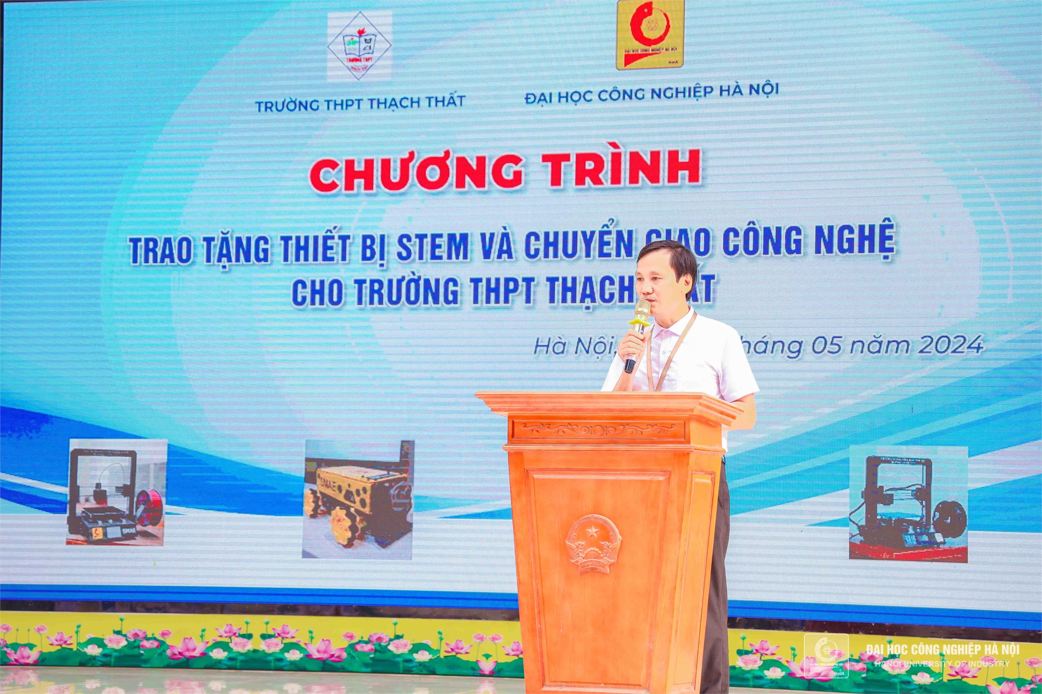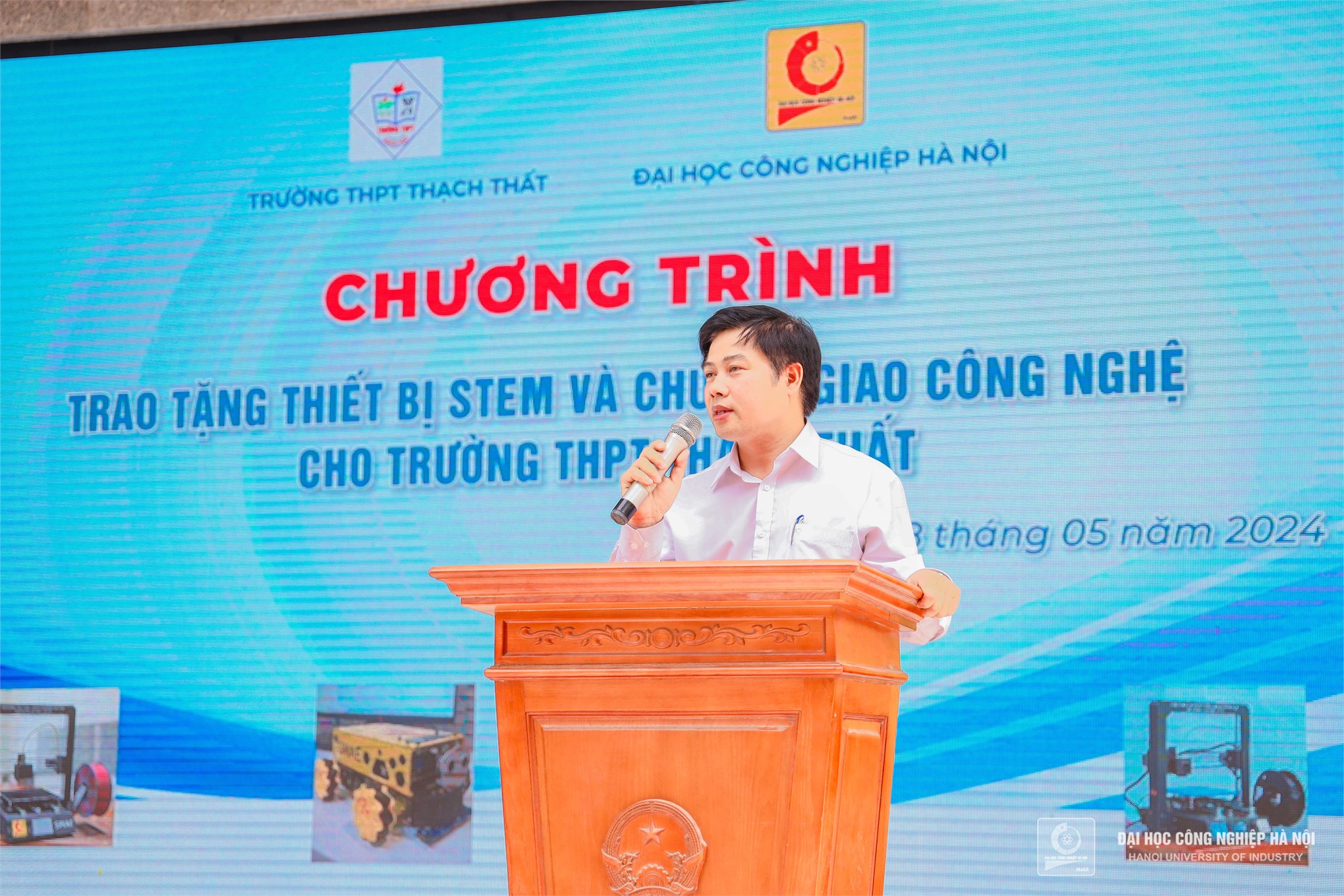 Gửi lời cảm ơn đến Trường Cơ khí – Ô tô, HaUI, Thầy Nguyễn Lễ - Phó Hiệu Trưởng Trường THPT Thạch Thất, Hà Nội nhấn mạnh: Thiết bị STEM do Trường Cơ Khí- Ô tô, HaUI tài trợ, chuyển giao công nghệ sẽ được Trường THPT Thạch Thất sử dụng hiệu quả cho công tác giảng dạy và nghiên cứu khoa học. Thầy cũng bày tỏ hy vọng, trong thời gian tới, Trường THPT Thạch Thất, Hà Nội sẽ tiếp tục nhận được sự hỗ trợ từ phía HaUI trong việc phát triển các đề tài nghiên cứu, các nhóm nghiên cứu