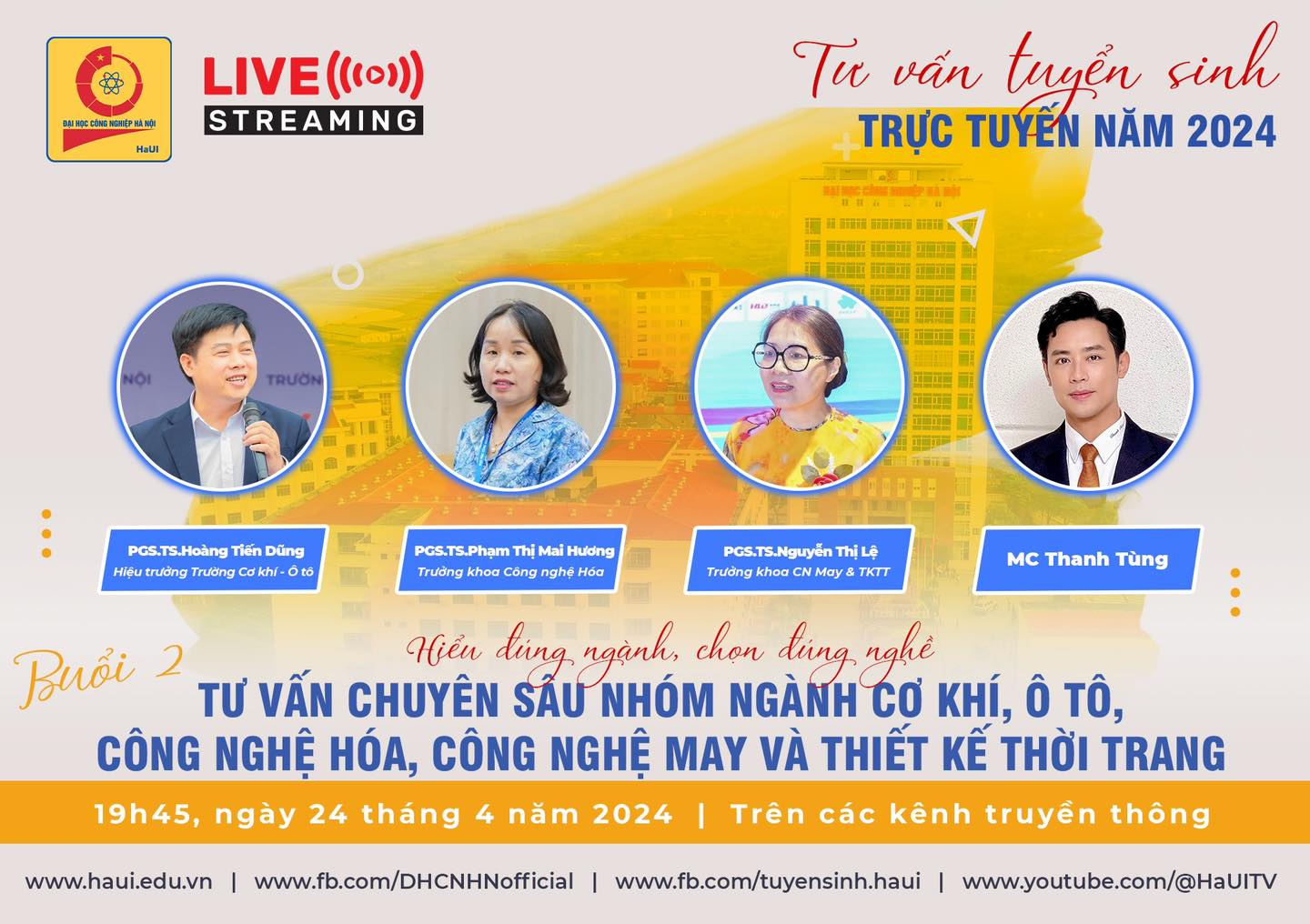 Tiếp nối thành công của đêm Tư vấn tuyển sinh - Những điều cần biết năm 2024, Đại học Công nghiệp Hà Nội tiếp tục tổ chức đêm Tư vấn tuyển sinh chuyên sâu nhóm ngành Cơ khí - Ô tô, Công nghệ Hóa, Công nghệ May và Thiết kế thời trang, vào 19h45 - 21h, Thứ 4, 24/4/2024