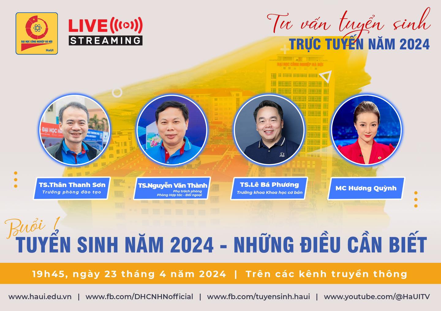 Vào khung giờ 19h45 - 21h,Thứ Ba, ngày 23/4, buổi LIVE STREAM đầu tiên với chủ đề: Tư vấn Tuyển sinh năm 2024 - Những điều cần biết, sẽ giải đáp mọi thắc mắc cho quý vị phụ huynh và các em học sinh về những thông tin chung trong mùa tuyển sinh 2024 của Đại học Công nghiệp Hà Nội.