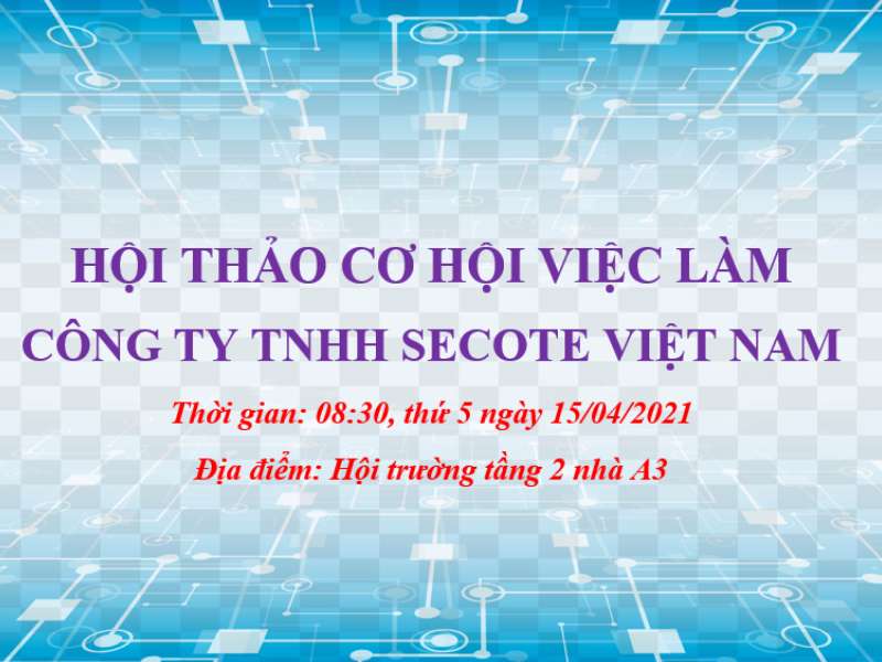 Trường Đại học Công nghiệp Hà Nội phối hợp với Công ty TNHH Secote Việt Nam tổ chức chương trình “Hội thảo việc làm và tuyển dụng trực tiếp của Công ty TNHH Secote Việt Nam”, nhằm giới thiệu việc làm cho cho sinh viên Đại học khoá 13, Cao đẳng khóa 21 và SV đã tốt nghiệp.