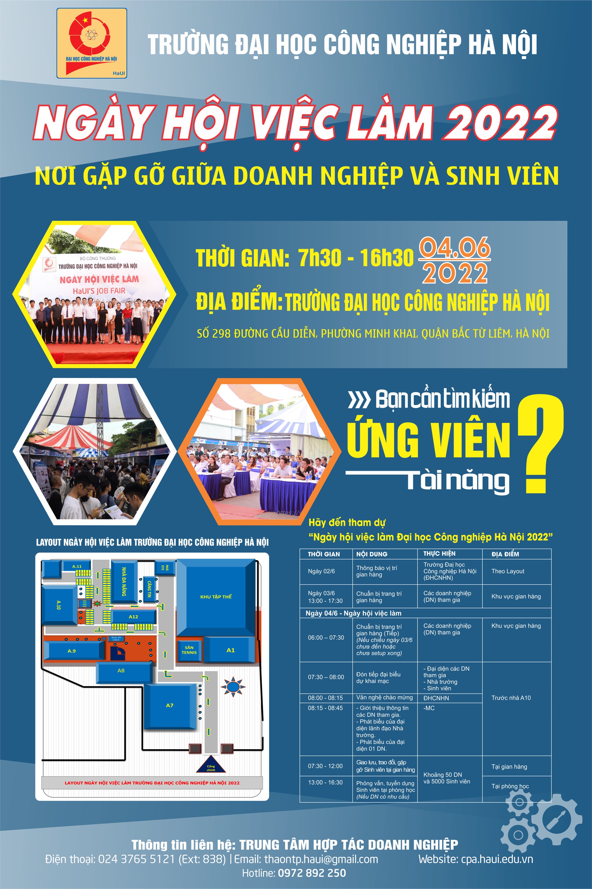 - Bộ thư mời Ngày hội việc làm Trường Đại học Công nghiệp Hà Nội năm 2022: Tải về tại đây - Các doanh nghiệp/tổ chức tham gia, vui lòng điền thông tin vào PHIẾU ĐĂNG KÝ và gửi lại Phiếu đăng ký bản đóng dấu, scan qua email thaontp.haui@gmail.com trước ngày 30/5/2022. |