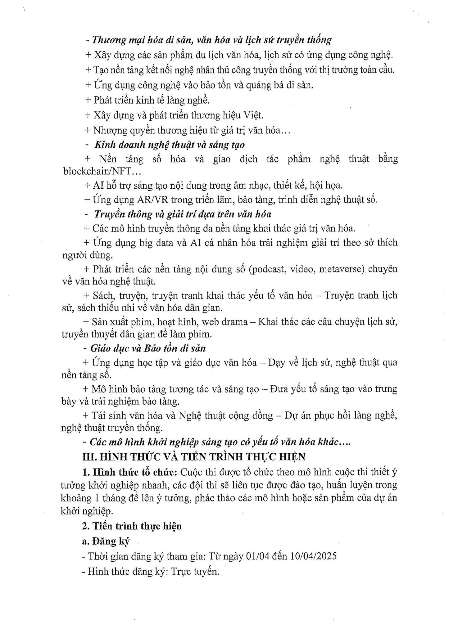 - Chất lượng: Nội dung các dự án khởi nghiệp đảm bảo tính sáng tạo, kết nối đa lĩnh vực, có gắn với yếu tố văn hóa và ứng dụng công nghệ, thế hiện mô hình kinh doanh hướng tới phát triển bền vững; tuân thủ các quy định của pháp luật.