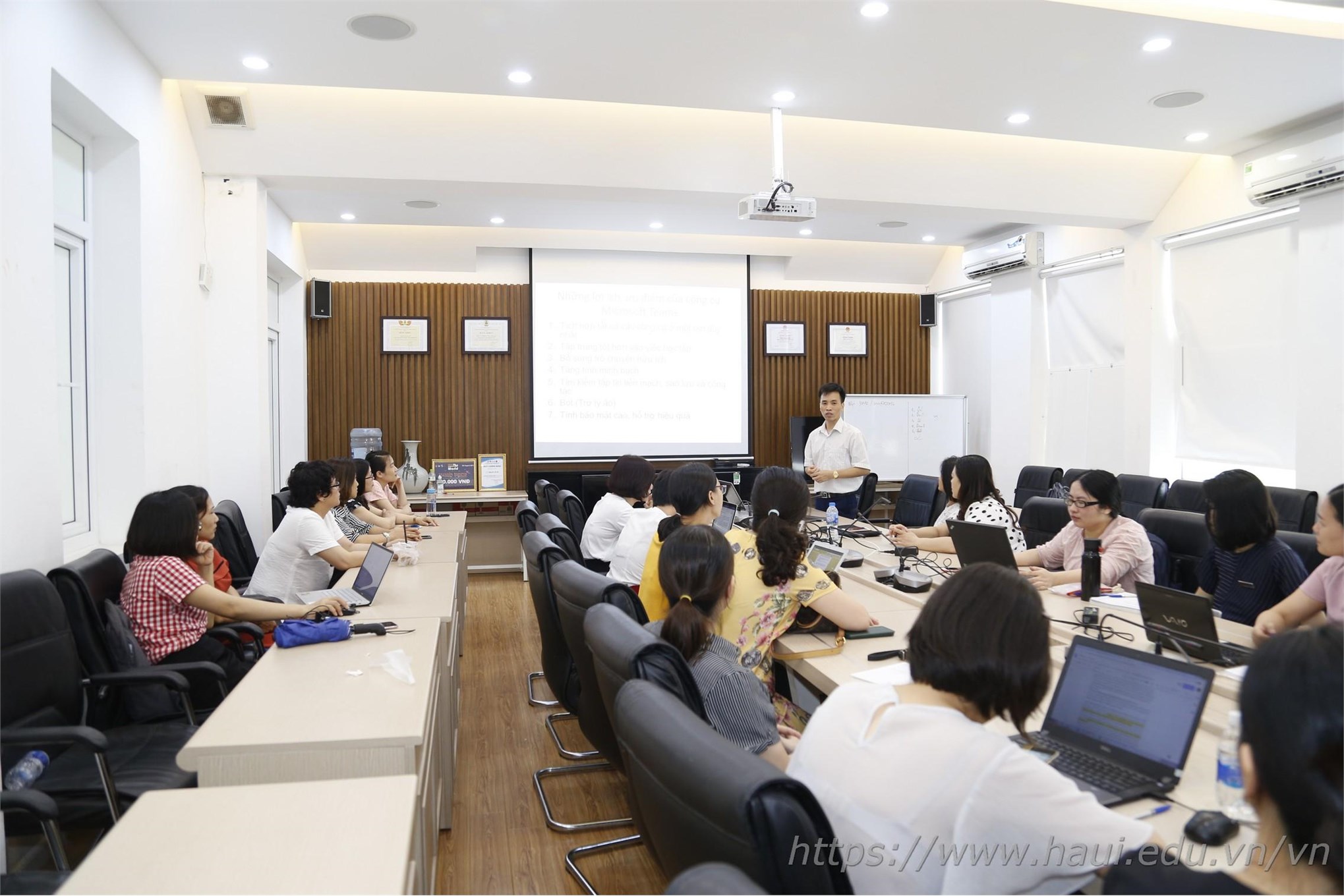 Ths. Lê Xuân Huyền trình bày báo cáo" Khai thác công cụ Microsoft Team tổ chức các lớp học trực tuyến: một giải pháp hiệu quả cho việc học tập, giảng dạy từ xa" tại Hội nghị Khoa học Khoa Ngoại ngữ