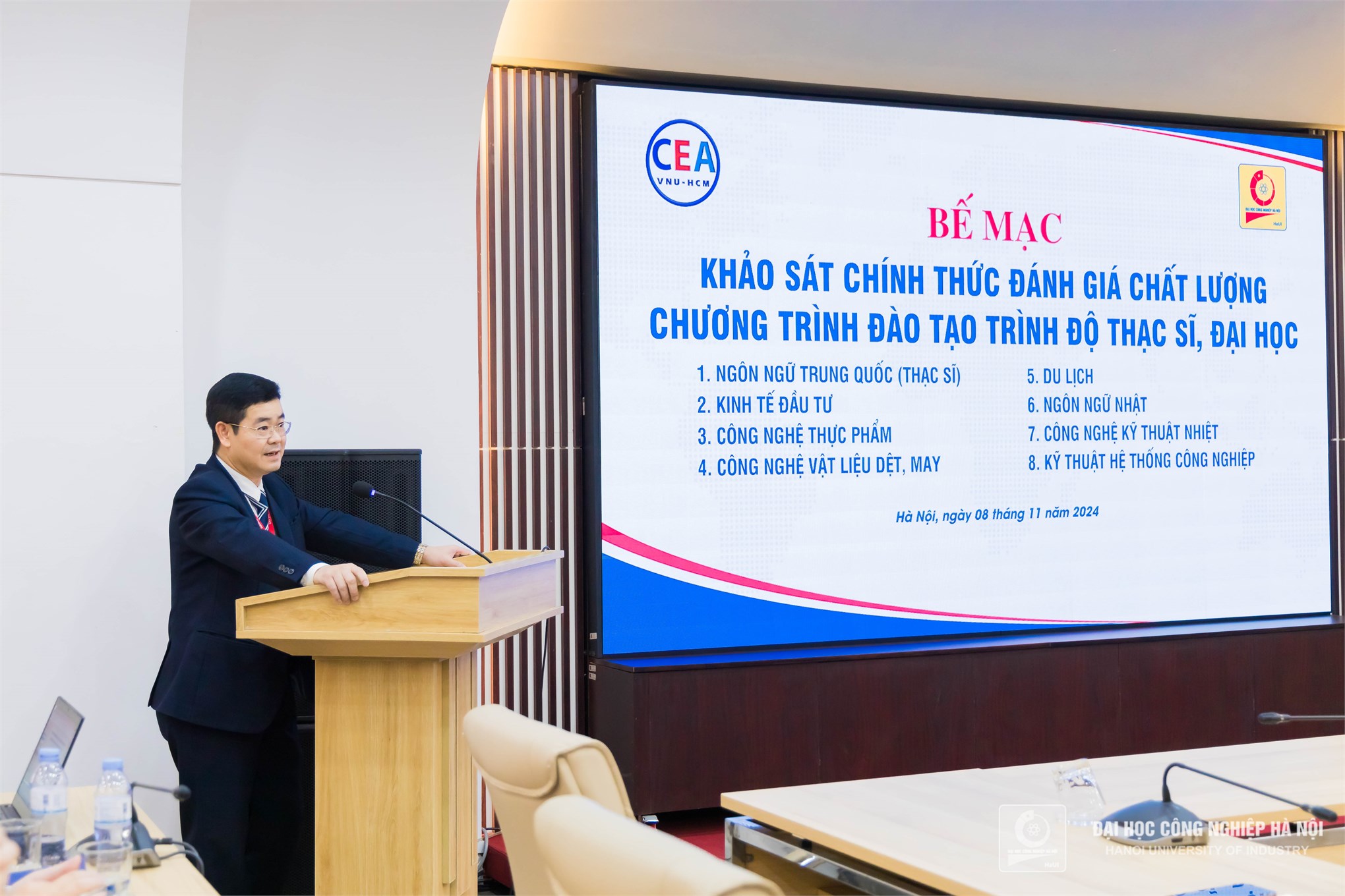 Từ ngày 05/11 - 08/11, Đoàn chuyên gia đánh giá ngoài của Trung tâm Kiểm định chất lượng giáo dục, Đại học Quốc gia TP. Hồ Chí Minh (KĐCLGD - ĐHQGTPHCM) phối hợp với Trường Đại học Công nghiệp Hà Nội thực hiện chương trình khảo sát chính thức đánh giá chất lượng 01 CTĐT thạc sĩ ngành Ngôn ngữ Trung Quốc và 07 CTĐT đại học các ngành: Kinh tế đầu tư; Công nghệ thực phẩm; Công nghệ vật liệu dệt may; Du lịch; Ngôn ngữ Nhật; Công nghệ kỹ thuật nhiệt; Kỹ thuật hệ thống công nghiệp.