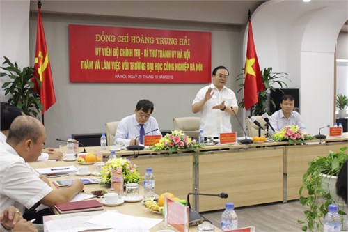 Trước những kiến nghị của Nhà trường, đồng chí Hoàng Trung Hải đã chỉ đạo cụ thể các sở, ngành của thành phố, quận Bắc Từ Liêm phối kết hợp với Nhà trường, nghiên cứu, đề xuất, sớm hiện thực hóa bằng hành động và có báo cáo cụ thể. Ngoài ra, với những kết quả đã đạt được, đồng chí Hoàng Trung Hải biểu dương và đánh giá cao sự nỗ lực của tập thể thầy và trò Nhà trường trong nhiệm vụ đào tạo phát triển nguồn nhân lực, nghiên cứu khoa học, xây dựng, bồi dưỡng và phát triển đội ngũ nhà giáo, nhà khoa học. Đồng chí Hoàng Trung Hải nhận định với vị thế và uy tín của Nhà trường như hiện nay đã chứng tỏ Trường Đại học Công nghiệp Hà Nội sớm nhận thức và có định hướng phát triển đúng, trúng trước những yêu cầu, đòi hỏi của xã hội về đào tạo nguồn nhân lực trong thời kỳ hội nhập và toàn cầu hóa.