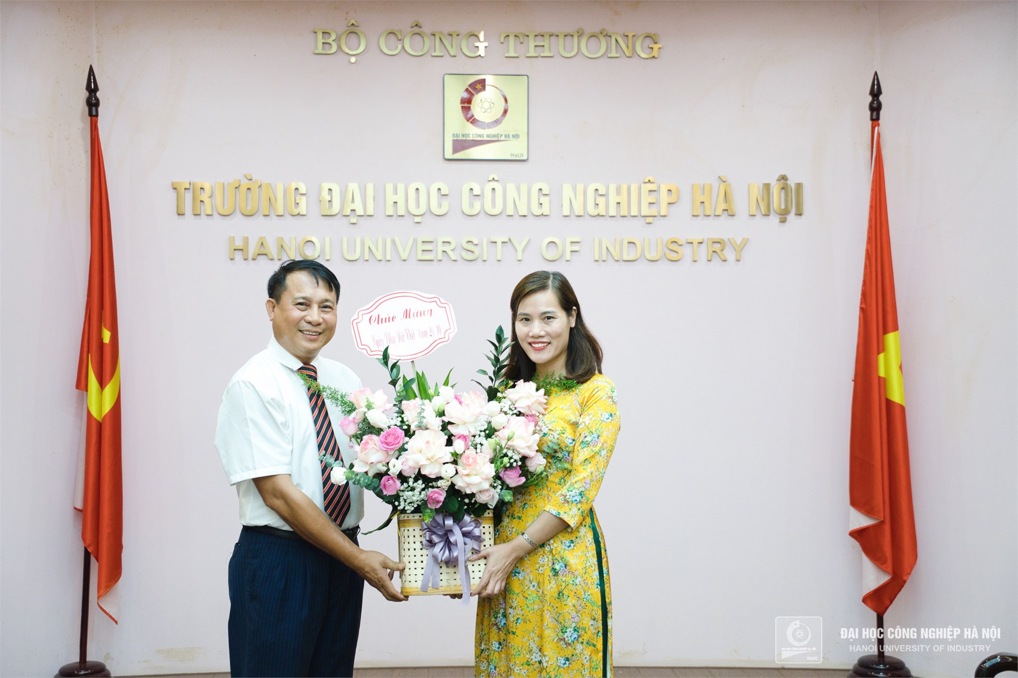 Đồng chí Lê Hồng Quân - Bí thư Đảng ủy, Chủ tịch Hội đồng trường, đồng chí Phan Đăng Hưng - Trưởng phòng Tổ chức Hành chính, đồng chí Nguyễn Hoàng Dương - Phó Chủ tịch Công đoàn trường tặng hoa chúc mừng chị em nhân ngày Phụ nữ Việt Nam 20/10