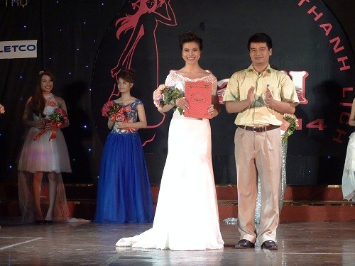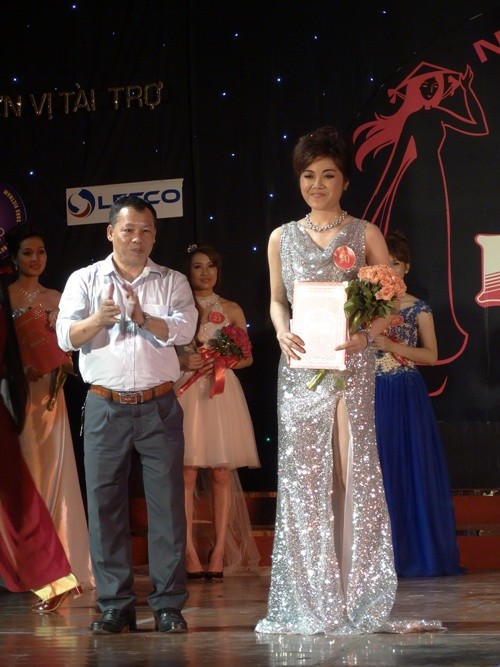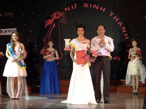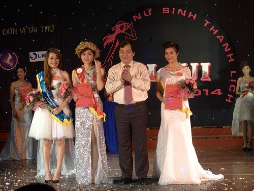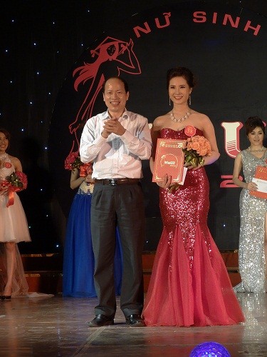 Đồng chí Hà Xuân Quang - Bí thư Đảng bộ, Phó Hiệu trưởng Nhà trường trao giải Thí sinh có trang phục dạ hội đẹp nhất cho thí sinh Lê Thị Khanh, SBD 38, đến từ khoa Kế toán-Kiểm toán