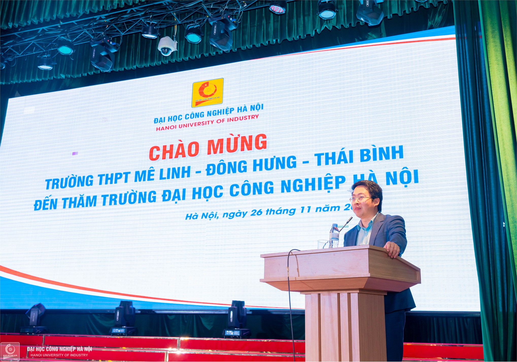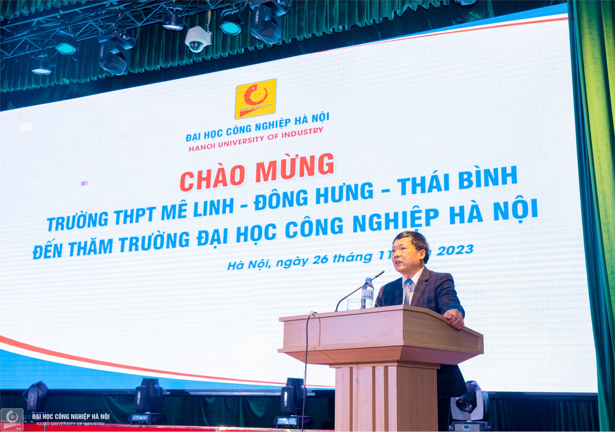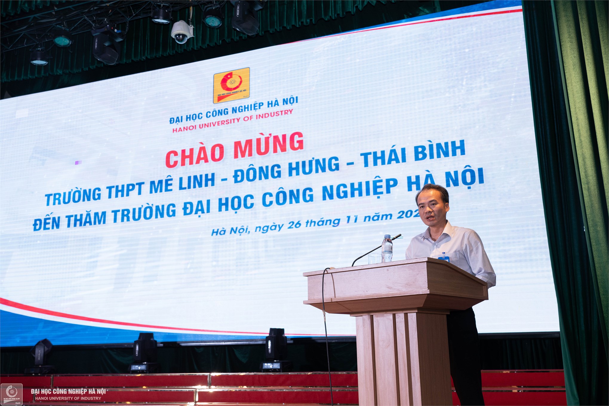 PGS.TS.Phạm Văn Bổng, Phó Hiệu trưởng Nhà trường giới thiệu về thế mạnh, ngành nghề đào tạo và những thông tin tổng quan về Đại học Công nghiệp Hà Nội. Thầy Phó Hiệu trưởng nhấn mạnh: Hiện nay, đang có hơn 2.500 sinh viên tỉnh Thái Bình đang theo học tại Đại học Công nghiệp Hà Nội, hy vọng năm học tiếp theo, Nhà trường sẽ được đón nhiều hơn các bạn học sinh từ Thái Bình và đặc biệt là từ trường THPT Mê Linh.