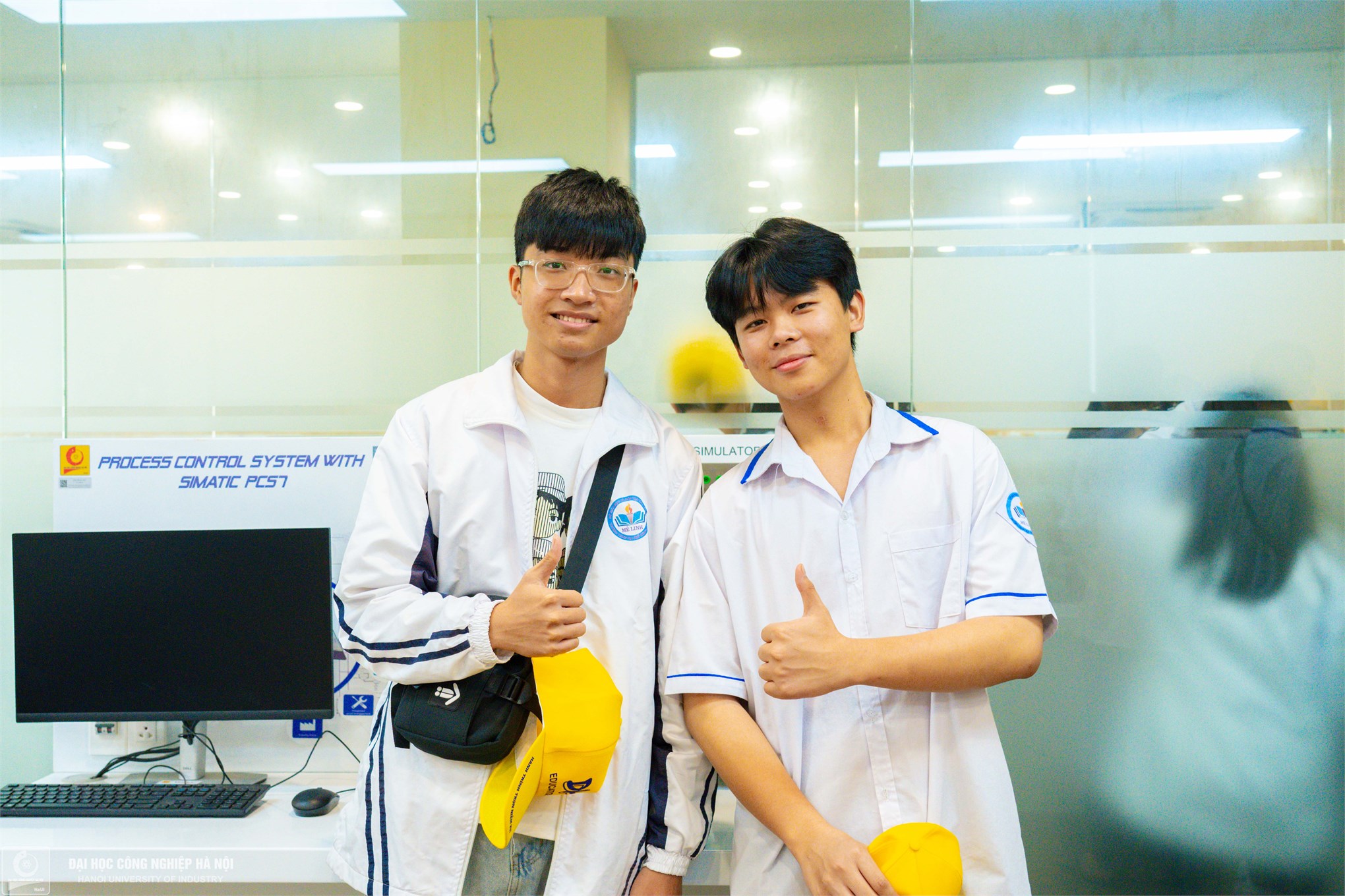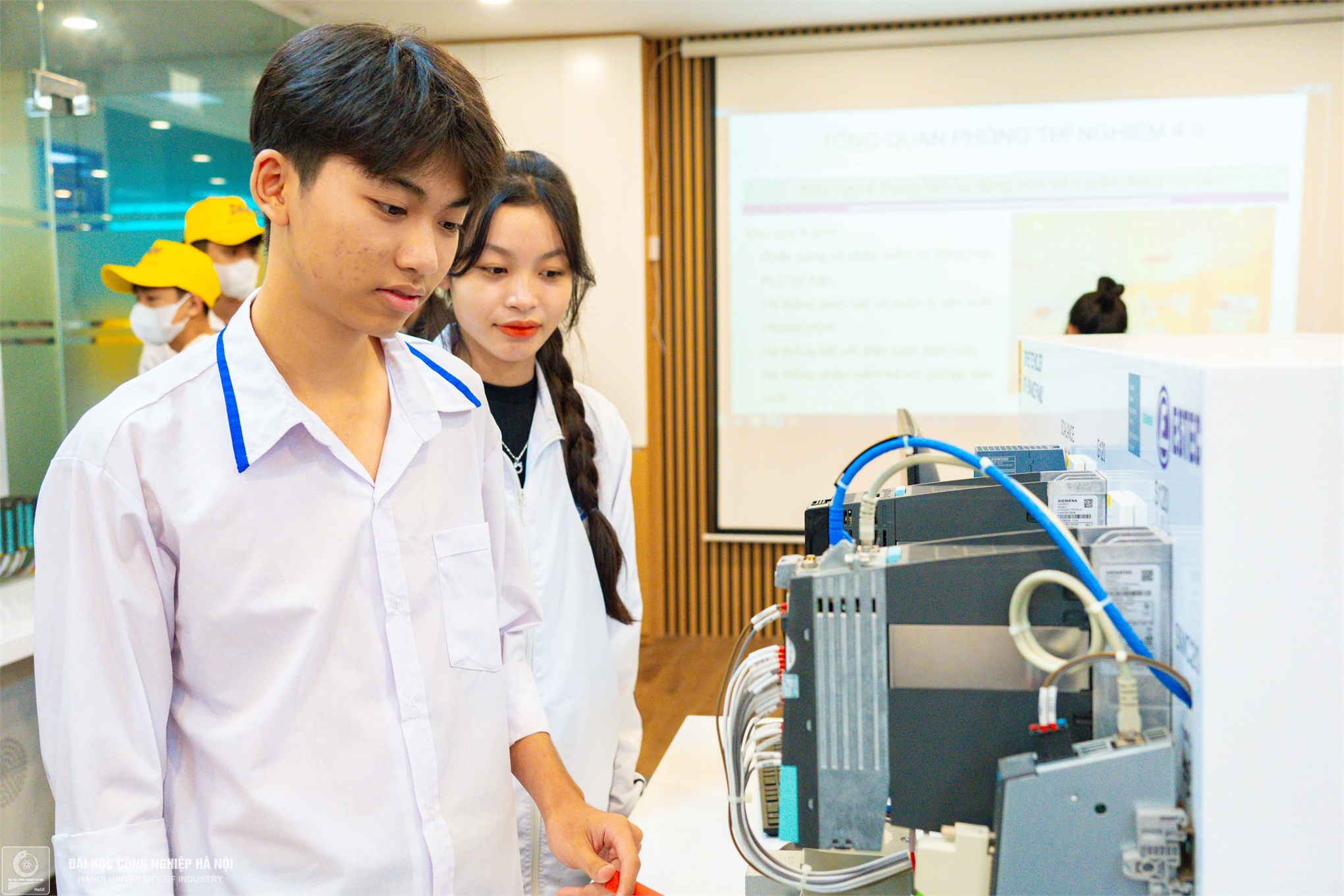 Minh Trúc (đeo kính) và cậu bạn thân đang tham quan mô hình nhà máy thông minh của trường Cơ khí – Ô tô