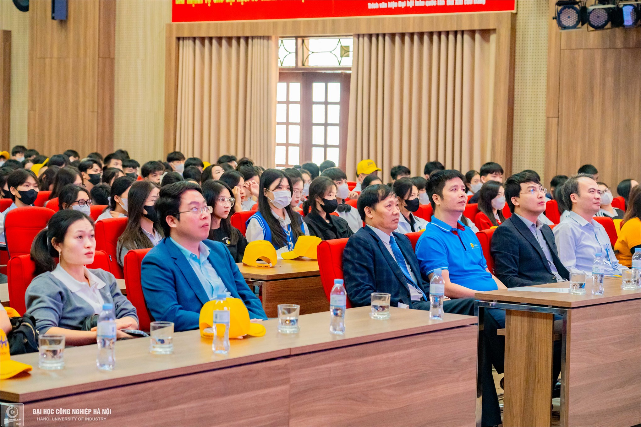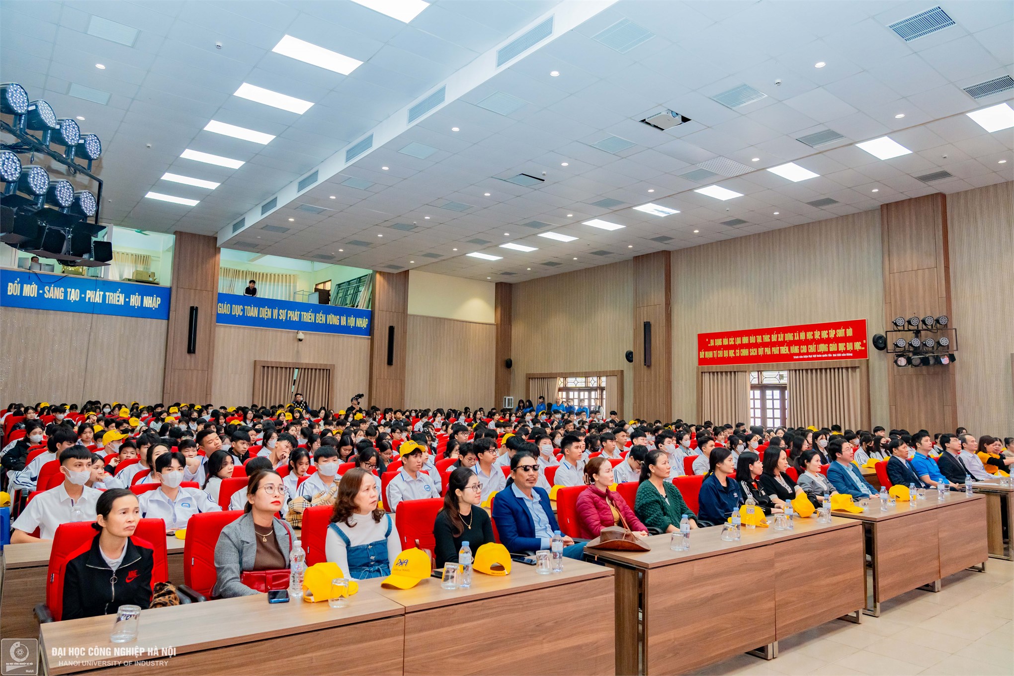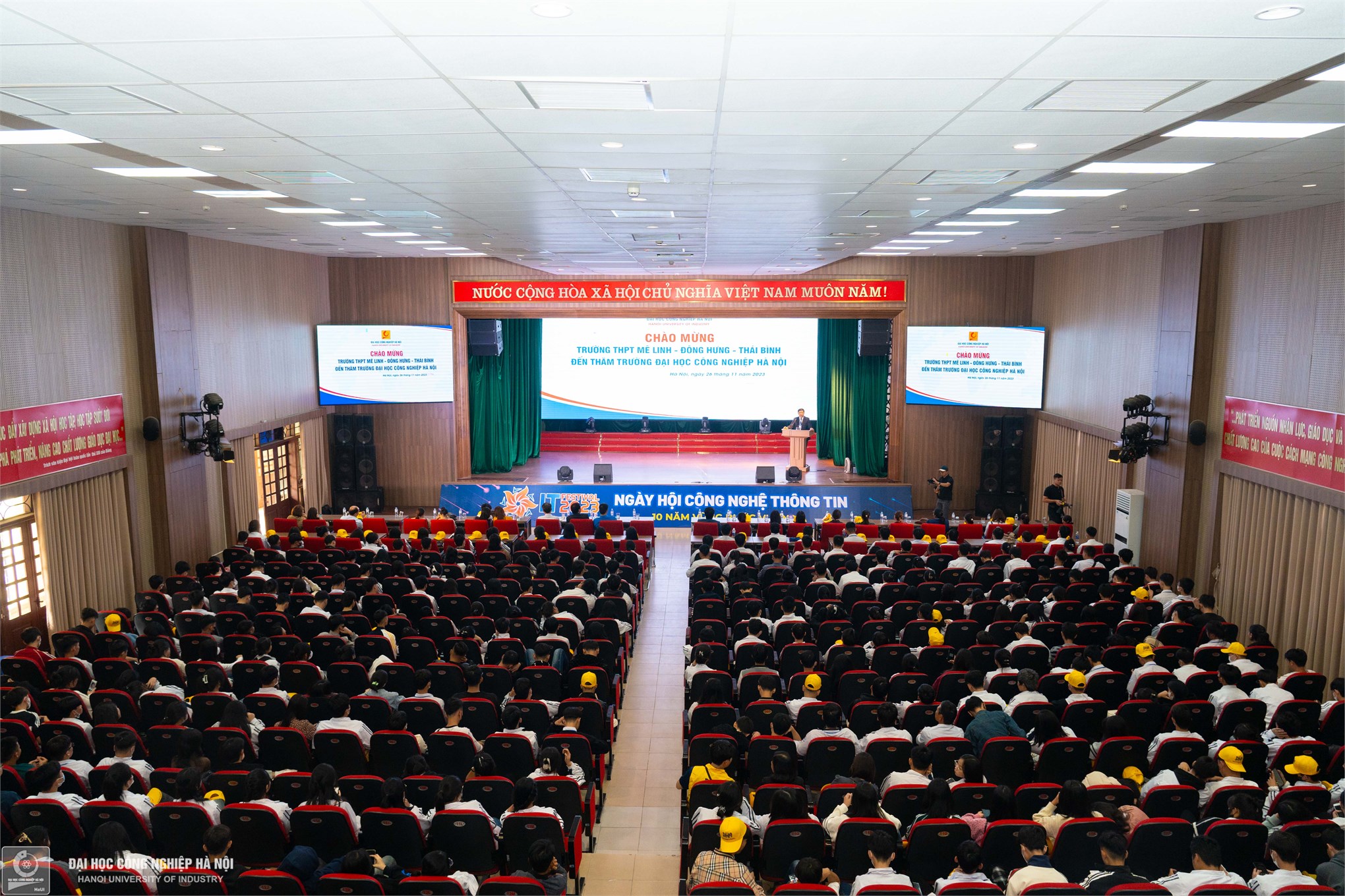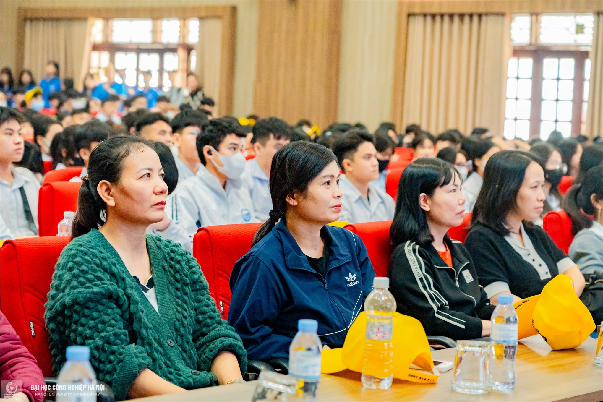 Gần 500 thầy cô giáo, phụ huynh và học sinh THPT Mê Linh đang chăm chú dõi theo giới thiệu về Đại học Công nghiệp Hà Nội