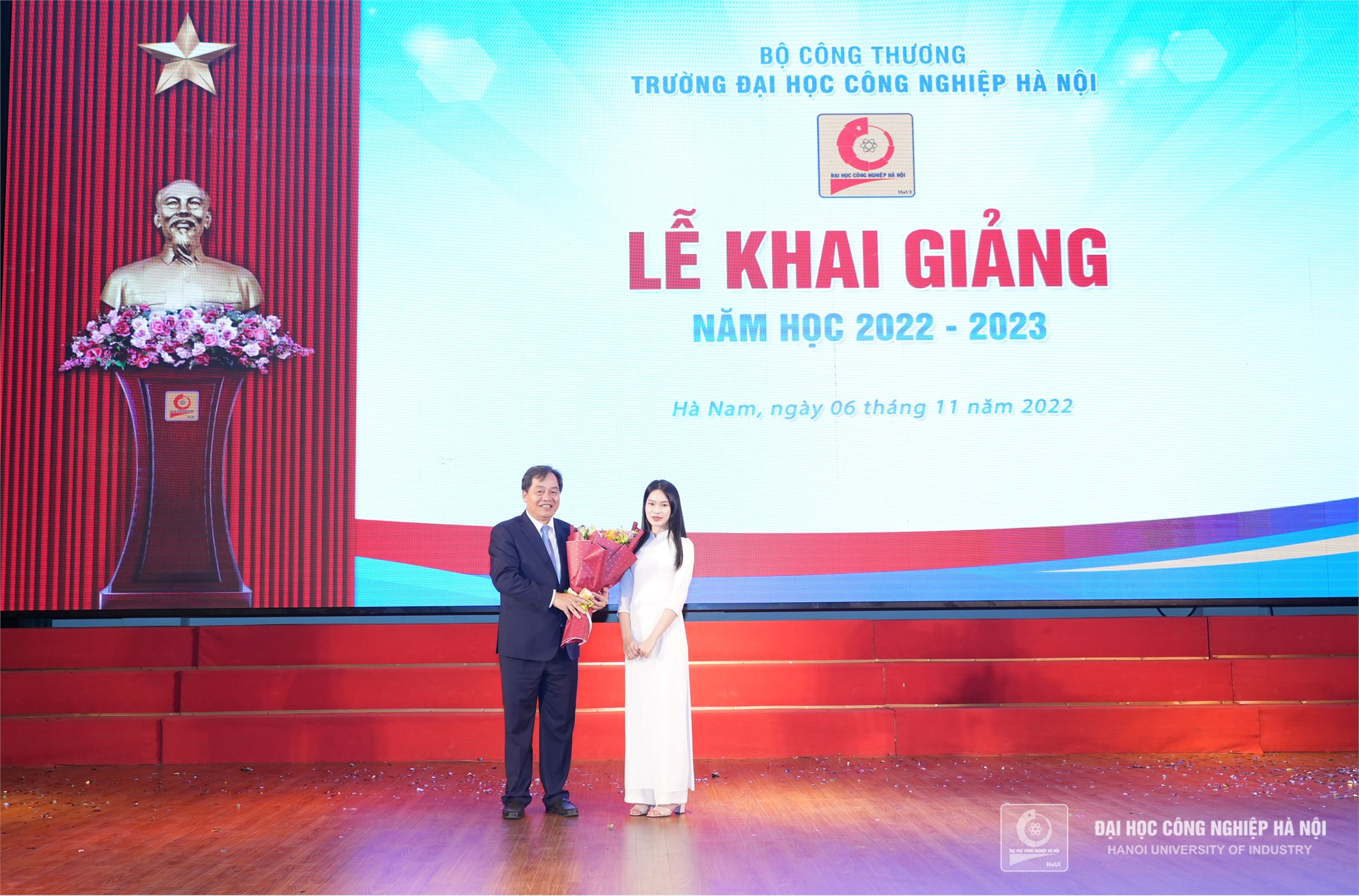 Sinh viên Lê Diệu Linh.- đại diện sinh viên Đại học Công nghiệp Hà Nội tặng hoa chúc mừng nhà trường trong Lễ khai giảng năm học 2022 - 2023