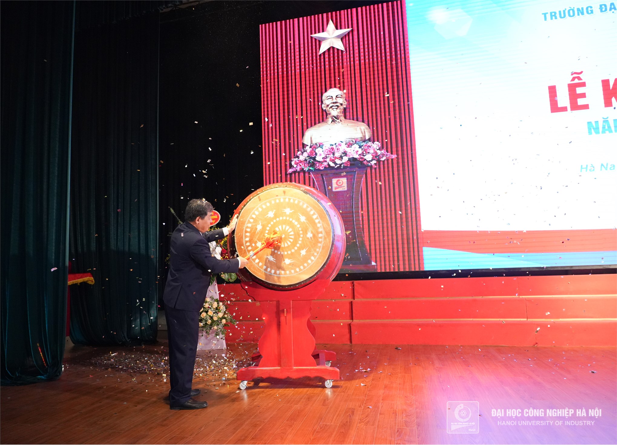 NGND.PGS.TS.Trần Đức Quý – Bí thư Đảng ủy, Hiệu trưởng Nhà trường gióng hồi trống giòn giã, khai giảng năm học 2022 - 2023 của trường Đại học Công nghiệp Hà Nội