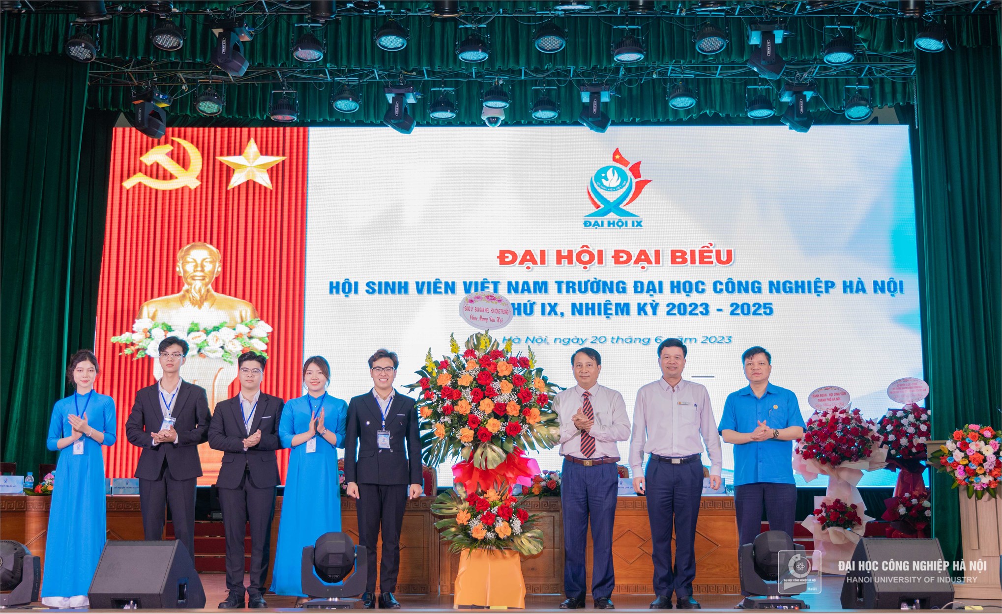 PGS.TS.Lê Hồng Quân, Bí thư Đảng uỷ, Chủ tịch Hội đồng Trường; TS.Kiều Xuân Thực, Phó Bí thư Đảng uỷ, Hiệu trưởng và đồng chí Trần Quang Hưng, Phó Bí thư Thành đoàn Hà Nội tặng hoa chúc mừng Ban Chấp hành Hội Sinh viên Việt Nam Trường Đại học Công nghiệp Hà Nội lần thứ IX, nhiệm kỳ 2023 – 2025