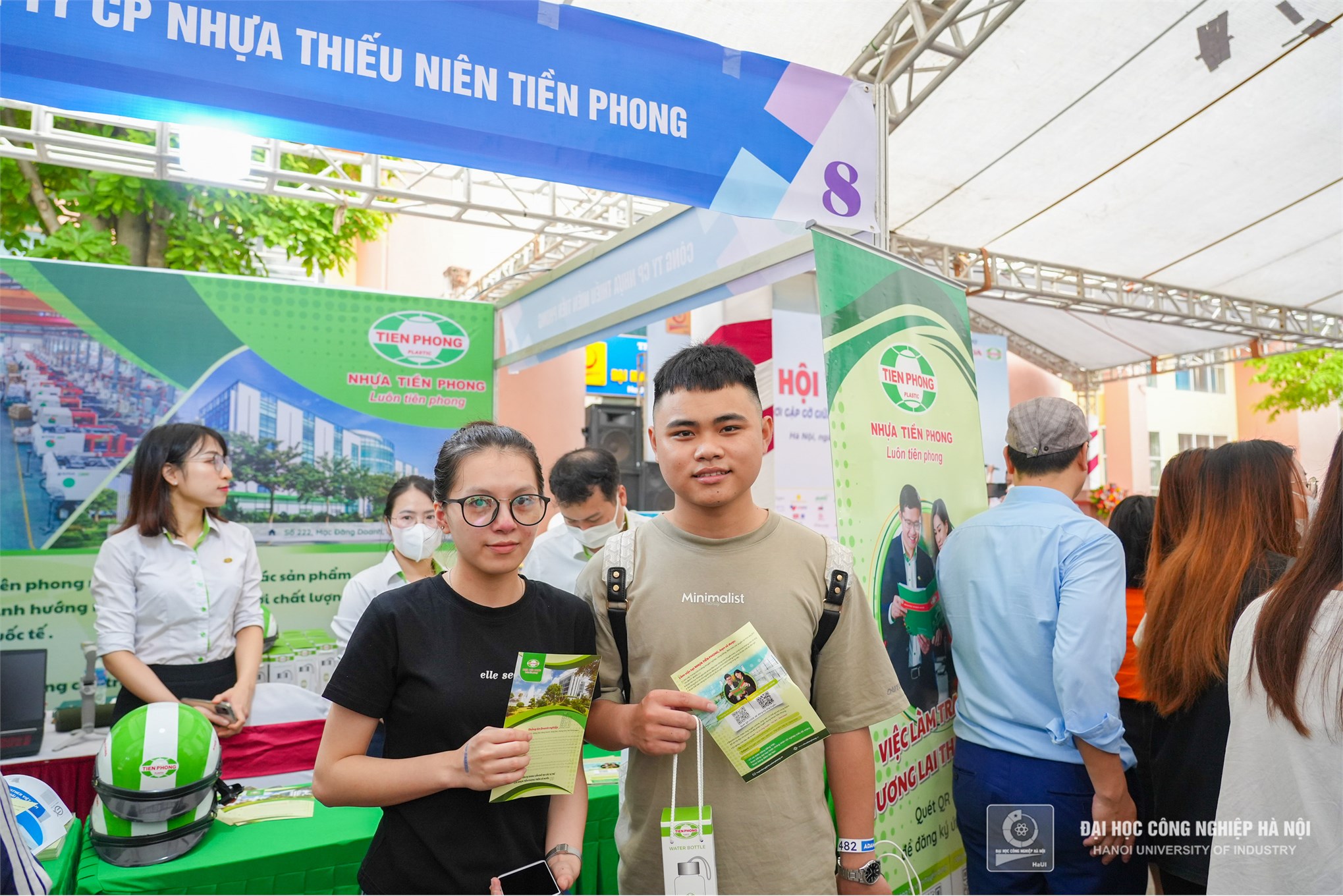 Hai bạn Nguyễn Ngọc Thắng và Phạm Quỳnh Trang - sinh viên cơ điện tử K15 đang tìm hiểu thông tin của Công ty Nhựa Thiếu niên Tiền phong. Hai bạn rất háo hức và hi vọng sẽ tìm được vị trí việc làm phù hợp ngay sau khi ra trường