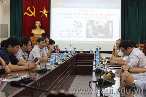 Sáng ngày 15/09/2016, Trường Đại học Công nghiệp Hà Nội đã tổ chức buổi gặp mặt cán bộ, giáo viên, sinh viên tham dự kỳ thi tay nghề ASEAN năm 2016 tại Malaysia. TS. Phạm Văn Bổng - Phó Hiệu trưởng Nhà trường đại diện cho Ban Giám hiệu đã có những căn dặn các huấn luyện viên và thí sinh trước khi tham dự kỳ thi này.