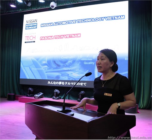 Phát biểu tại buổi làm việc, TS. Bùi Thị Ngân – Phó Hiệu trưởng Nhà trường gửi lời cảm ơn lãnh đạo Nissan Automotive Technology Việt Nam và Pasona Tech Việt Nam đã luôn quan tâm, đồng hành và hỗ trợ sinh viên ĐHCNHN trong việc nâng cao kiến thức và tay nghề. Hy vọng sẽ có nhiều sự hợp tác hiệu quả giữa công ty và nhà trường trong thời gian tới.