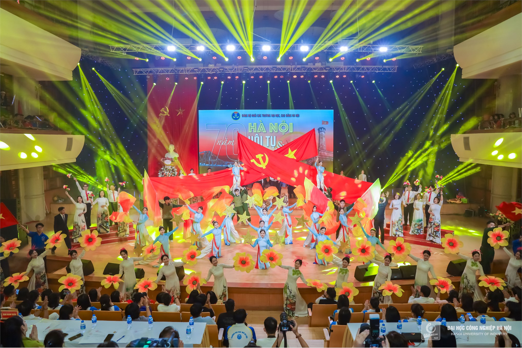 Từ giải phóng Thủ đô năm 1954, đến nay tròn 70 năm, Hà Nội giờ đây đã chuyển mình mạnh mẽ, mang một khát vọng “rồng bay” từ nền tảng văn hiến ngàn đời. Hà Nội đang từng bước phát huy sức mạnh tổng hợp nguồn lực, khẳng định vai trò là trung tâm chính trị, kinh tế - văn hóa của cả nước. Đây không những là niềm vui của người dân thủ đô, mà còn là niềm tự hào của nhân dân cả nước. Hướng về mốc son lịch sử ấy, Đảng ủy Khối các trường đại học cao đẳng Hà Nội phát động các hoạt động văn hóa, nghệ thuật chào mừng, với 57 trường tham gia và 229 tiết mục chia làm 5 cụm thi. Đại học Công nghiệp Hà Nội xuất sắc đạt giải Nhất cụm IV cùng với 4 trường tham dự đêm chung kết được tổ chức tại Học viện âm nhạc quốc gia Việt Nam tối 7/10.
