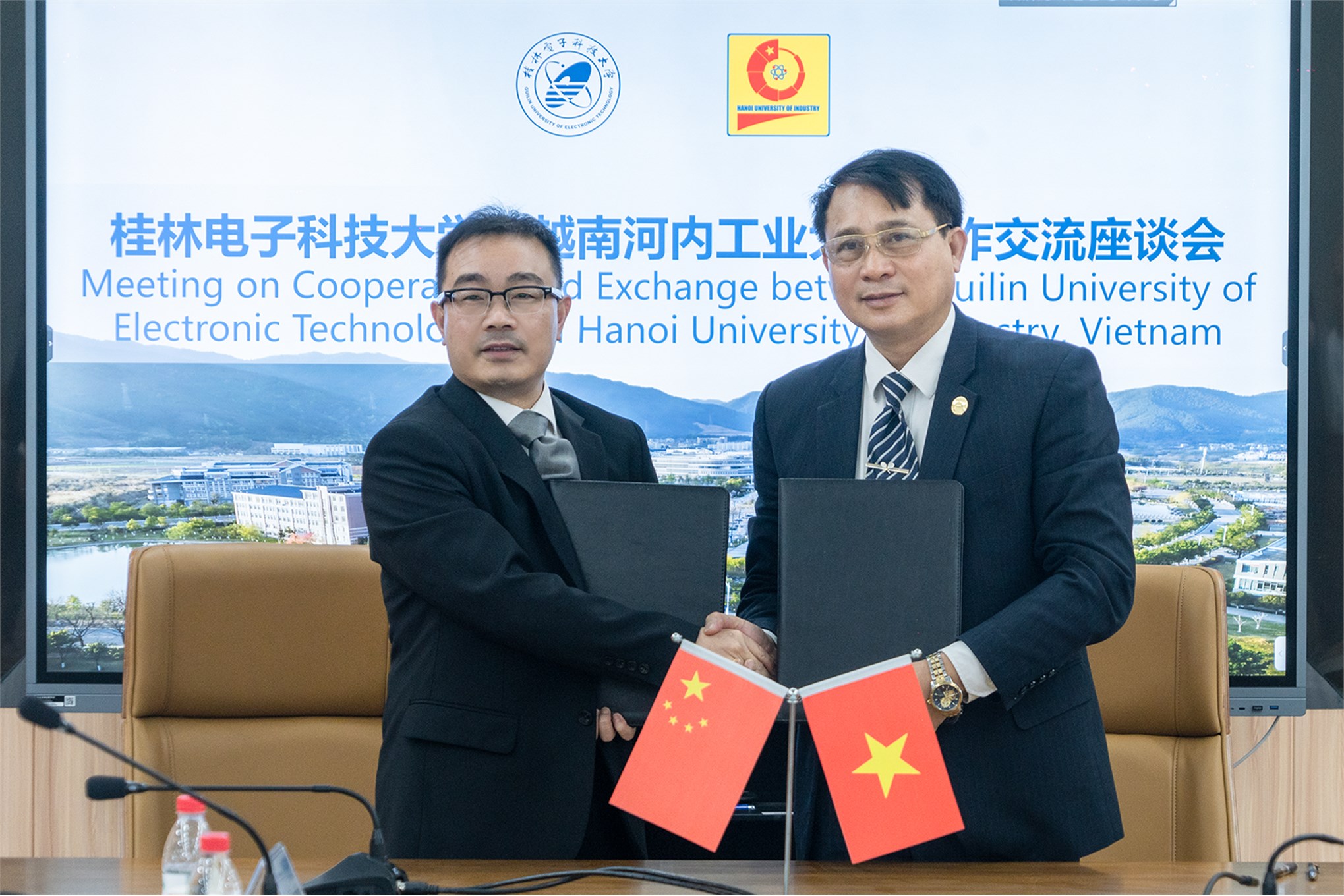 PGS.TS.Lê Hồng Quân, Bí thư Đảng ủy, Chủ tịch Hội đồng trường Trường Đại học Công nghiệp Hà Nội và ông Từ Hoa Nhị, Hiệu trưởng Trường Đại học Khoa học Kỹ thuật điện tử Quế Lâm thực hiện nghi thức ký kết thỏa thuận chung về hợp tác sinh viên, giảng viên, nghiên cứu khoa học, trao đổi học liệu