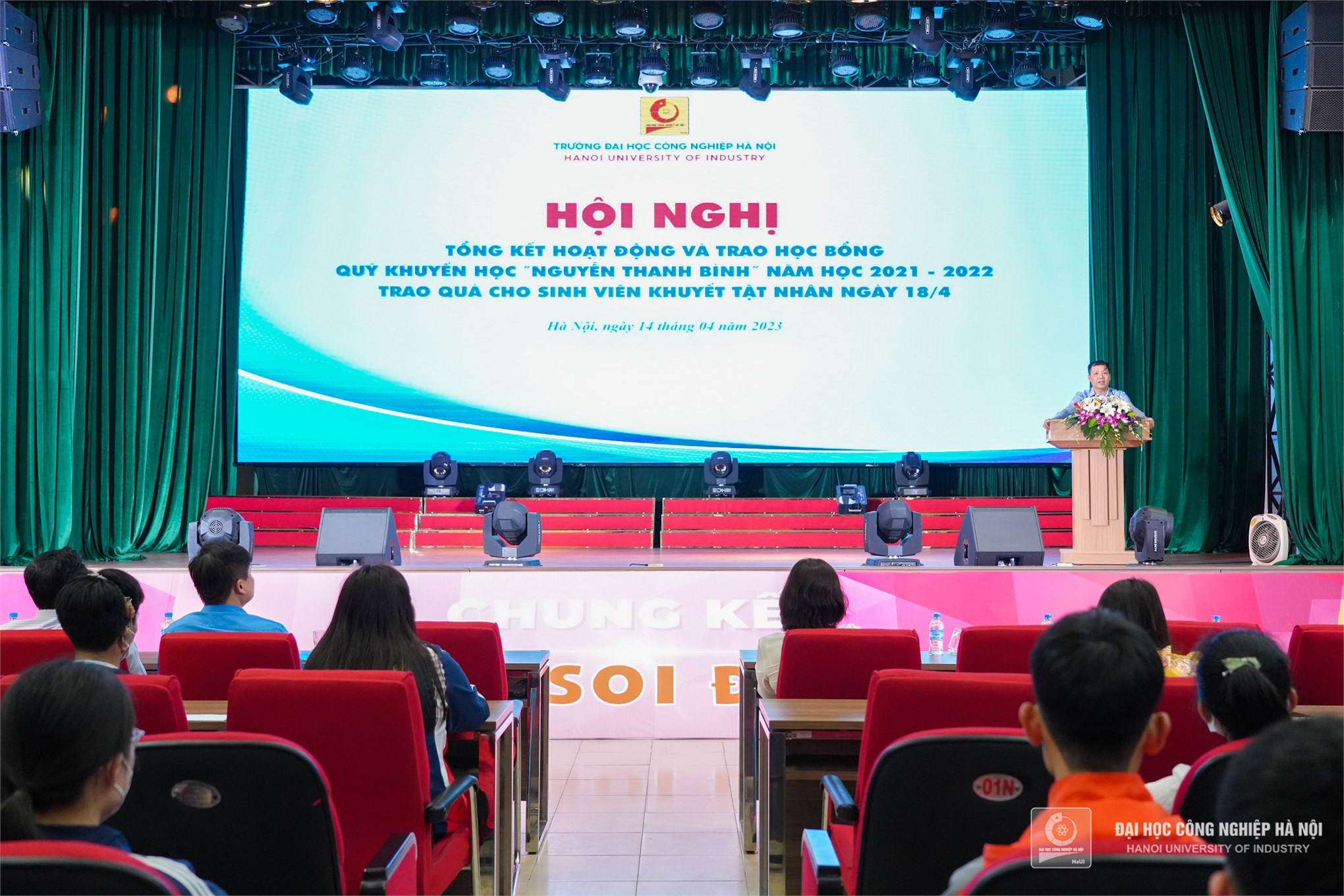 Chiều ngày 14/4, 208 xuất học bổng Nguyễn Thanh Bình ( tổng giá trị gần 400 triệu) đã được Đại học Công nghiệp Hà Nội trao tặng cho sinh viên đạt thành tích cao trong học tập và rèn luyện; SV đạt giải Nhất nghiên cứu khoa học. PGS.TS.Phạm Văn Bổng - Phó Hiệu trưởng Nhà trường dự và trao học bổng cho sinh viên.