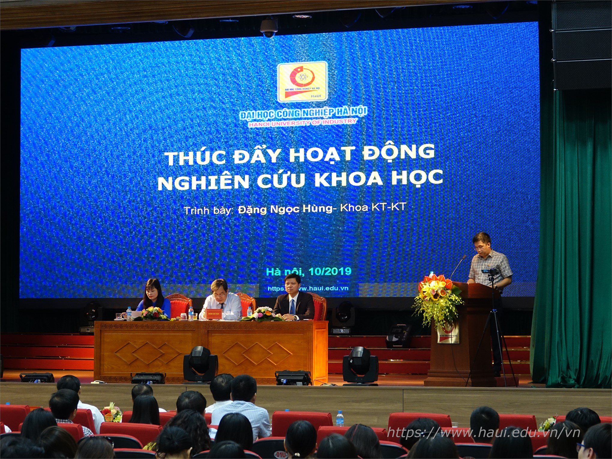PGS.TS. Đặng Ngọc Hùng - Trưởng Khoa Kế toán Kiểm toán trình bày tham luận :"Thúc đẩy hoạt động nghiên cứu khoa học của giảng viên Trường Đại học Công nghiệp Hà Nội"
