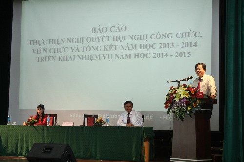 Hội nghị đã nghe TS. Trần Đức Quý - Hiệu trưởng Nhà trường thông qua báo cáo thực hiện nghị quyết Hội nghị công chức viên chức năm học 2013 - 2014 và phương hướng, nhiệm vụ của Nhà trường năm học 2014 - 2015. Trong năm học 2013 - 2014, toàn thể công chức, viên chức Nhà trường luôn đoàn kết và phát huy sức mạnh nội lực, tinh thần trách nhiệm của tập thể để thực hiện thắng lợi những nhiệm vụ đã đề ra. Đó là xã hội hoá giáo dục, từng bước nâng cao chất lượng đào tạo, duy trì và củng cố nền nếp giảng dạy, học tập, công tác, mở rộng và phát triển quy mô, ngành nghề đào tạo, đặc biệt không ngừng nâng cao chất lượng cuộc sống của công chức, viên chức, người lao động. TS.Trần Đức Quý đã trình bày, giải đáp các ý kiến đóng góp được gửi về từ Hội nghị cán bộ viên chức cơ sở.