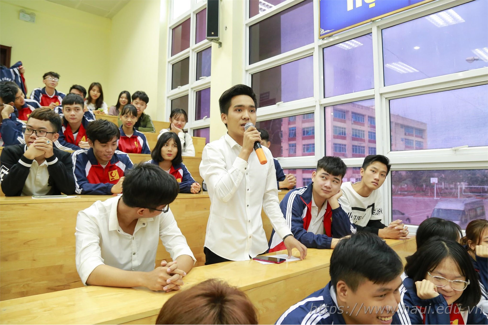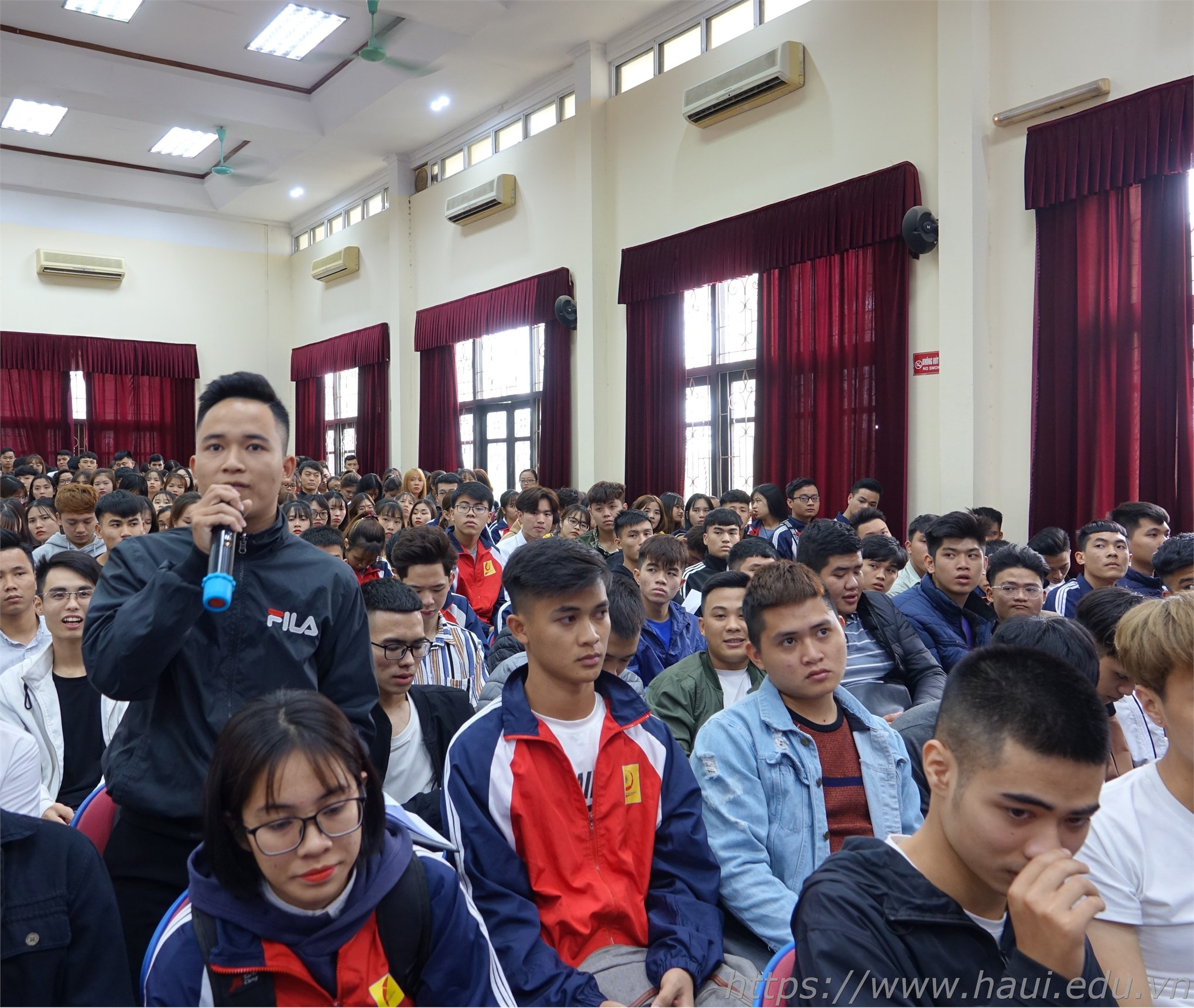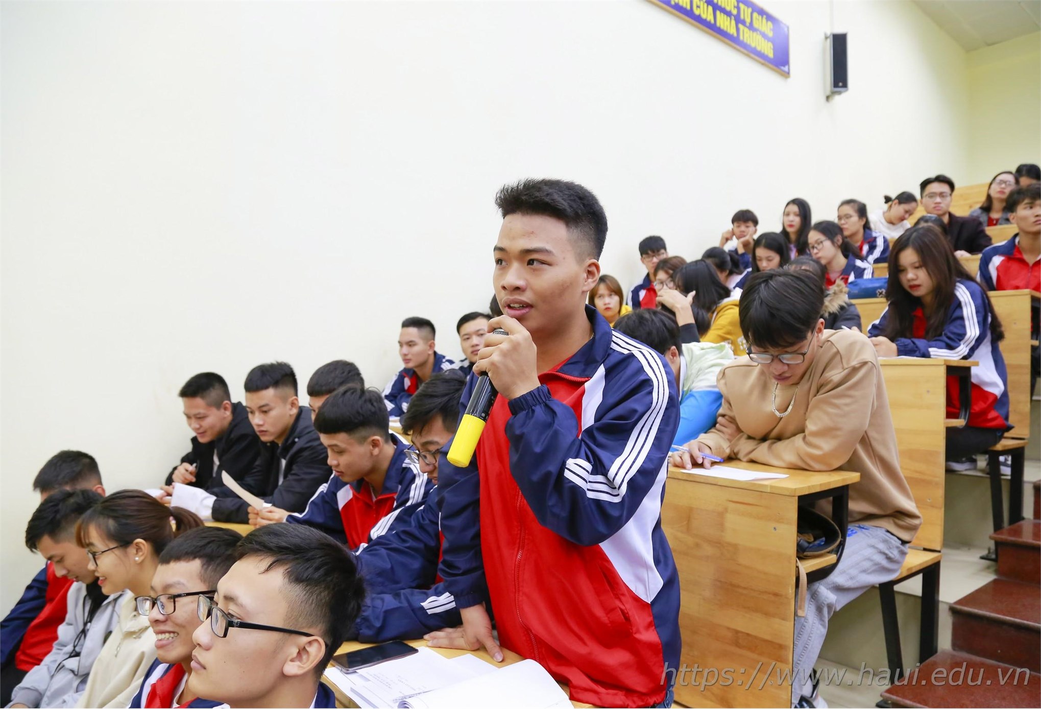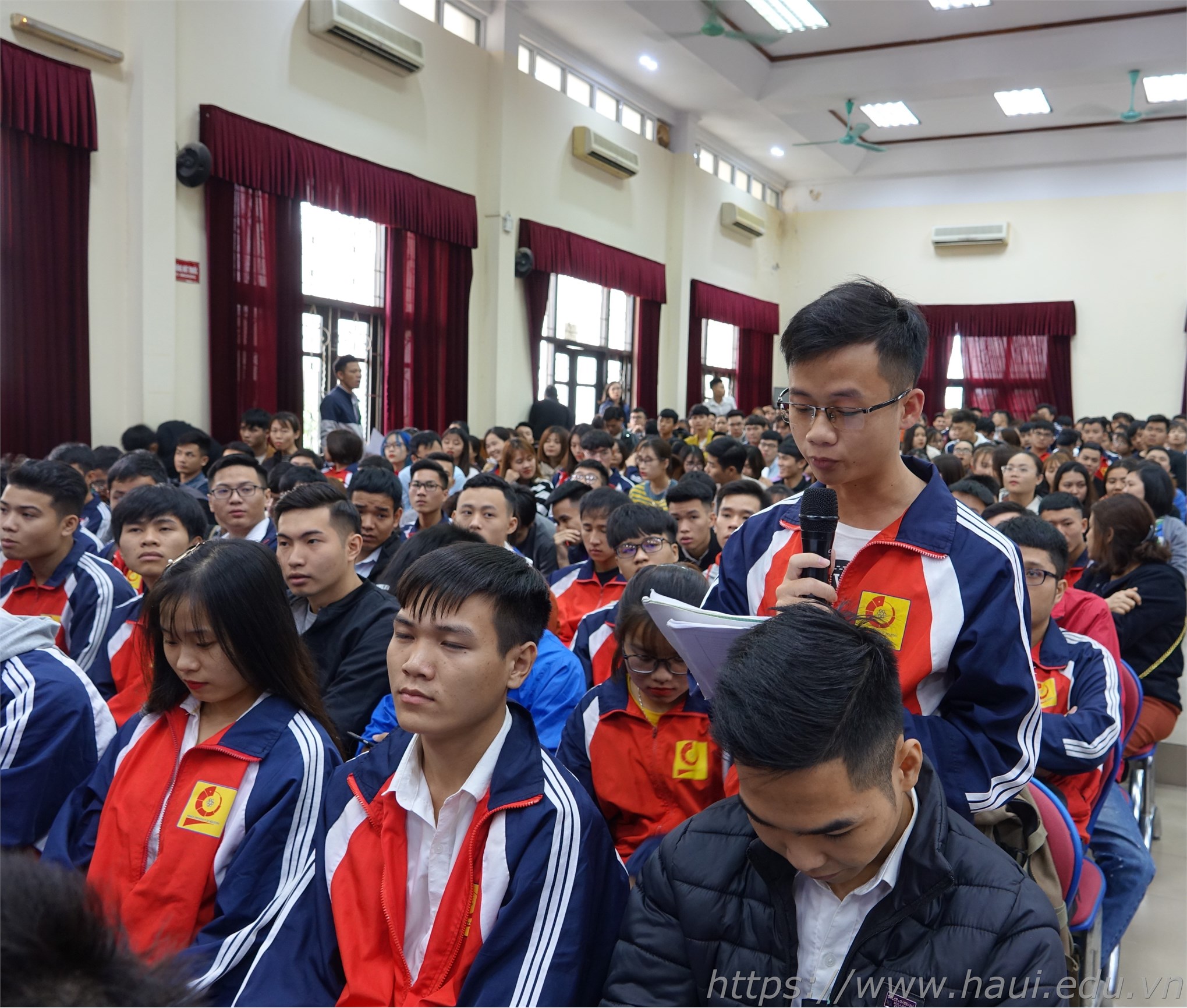 PGS.TS.Phạm Văn Bổng - Phó Hiệu trưởng Nhà trường đã trực tiếp giải đáp các câu hỏi, phản ánh của sinh viên trên tất cả các mặt hoạt động của nhà trường như: trao đổi về vấn đề thực tập và điều kiện xét tốt nghiệp; đề xuất hỗ trợ mạng internet và một số cơ sở vật chất phục vụ ở phòng học; vấn để về thẻ bảo hiểm y tế; thắc mắc về lịch học, lịch thi; đề xuất các hoạt động thể dục thể thao, văn hóa văn nghệ cho sinh viên.